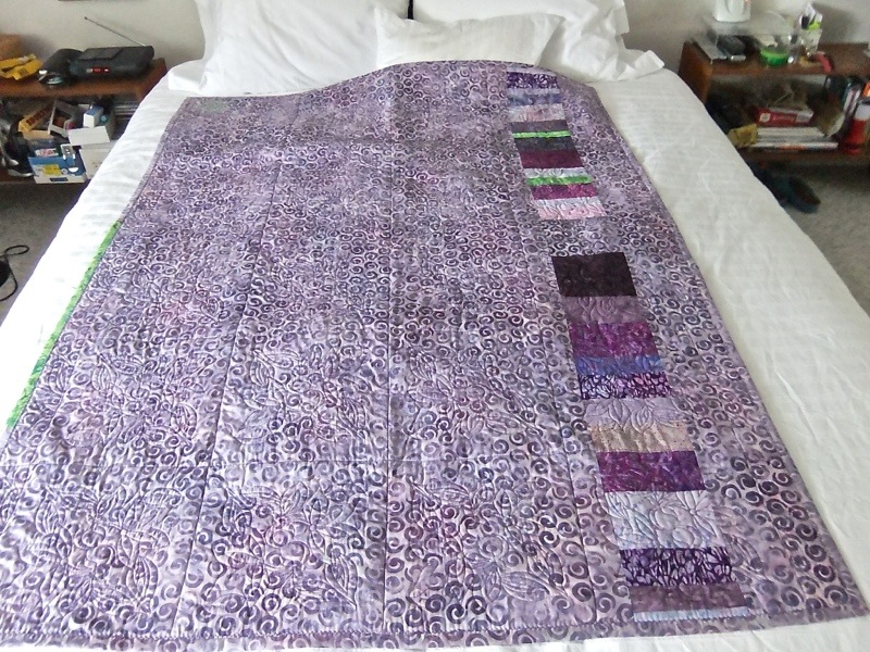 I had a “scrap bag” from Keepsake Quilting with twelve 9″ (width-of-fabric) cuts of fabric in coordinated colours. 9″ yields 4 strips @ 2 1/4″ (rather than the usual 2 1/2″) – enough to make a 44 X 62 quilt.