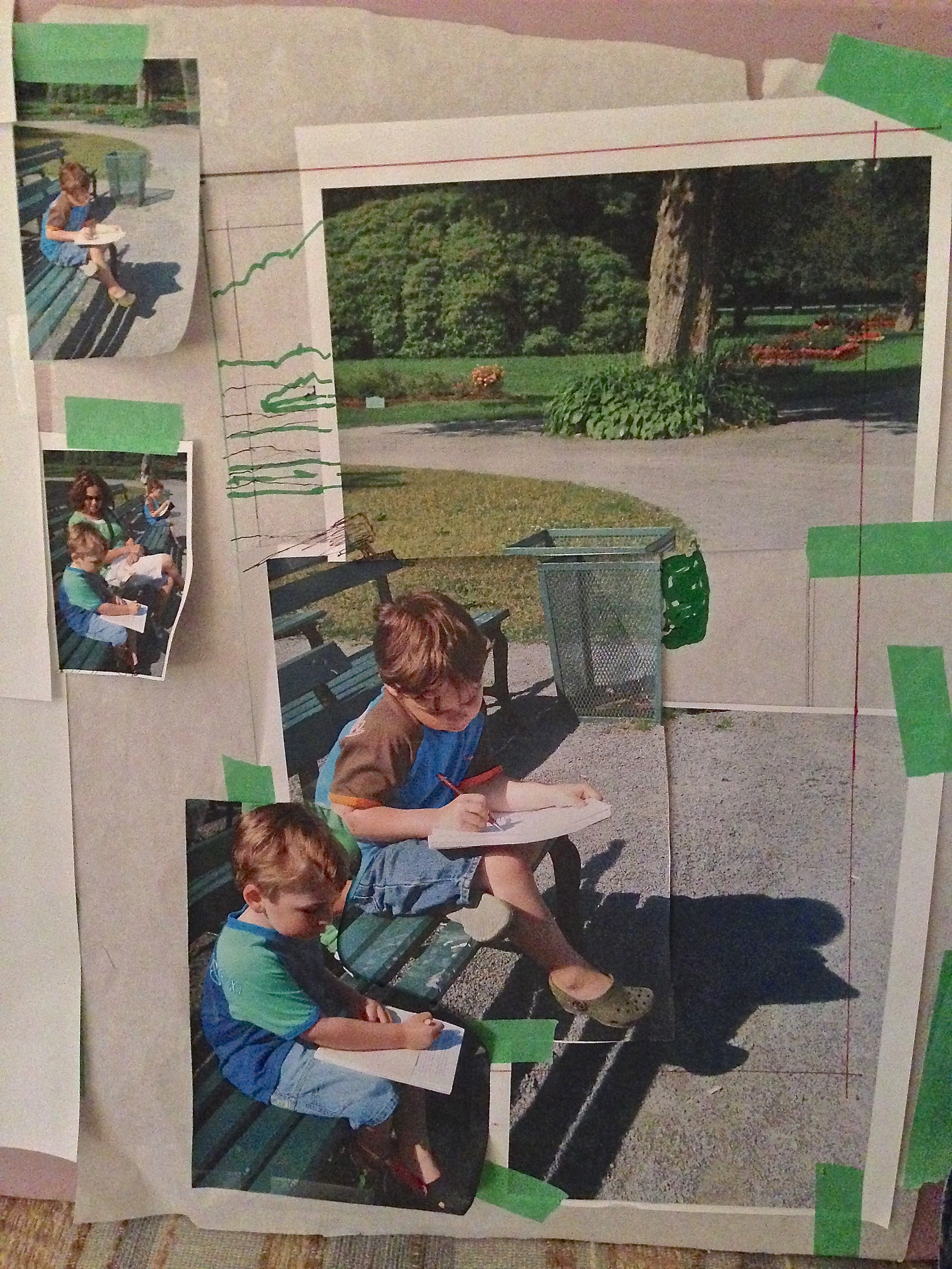 After finishing Asparagus Field in late September, I started a second art quilt: I had photos of my two oldest great-nephews taken a number of years ago when they were 4 1/2 and 6 on a visit to the Public Gardens (in Halifax) – I decided to combine two photos into a single image so both boys would be in the work. I enlarged the photos using Photoshop and printed out sections from which to assemble the piece which I wanted to be ~15″ X 23″.