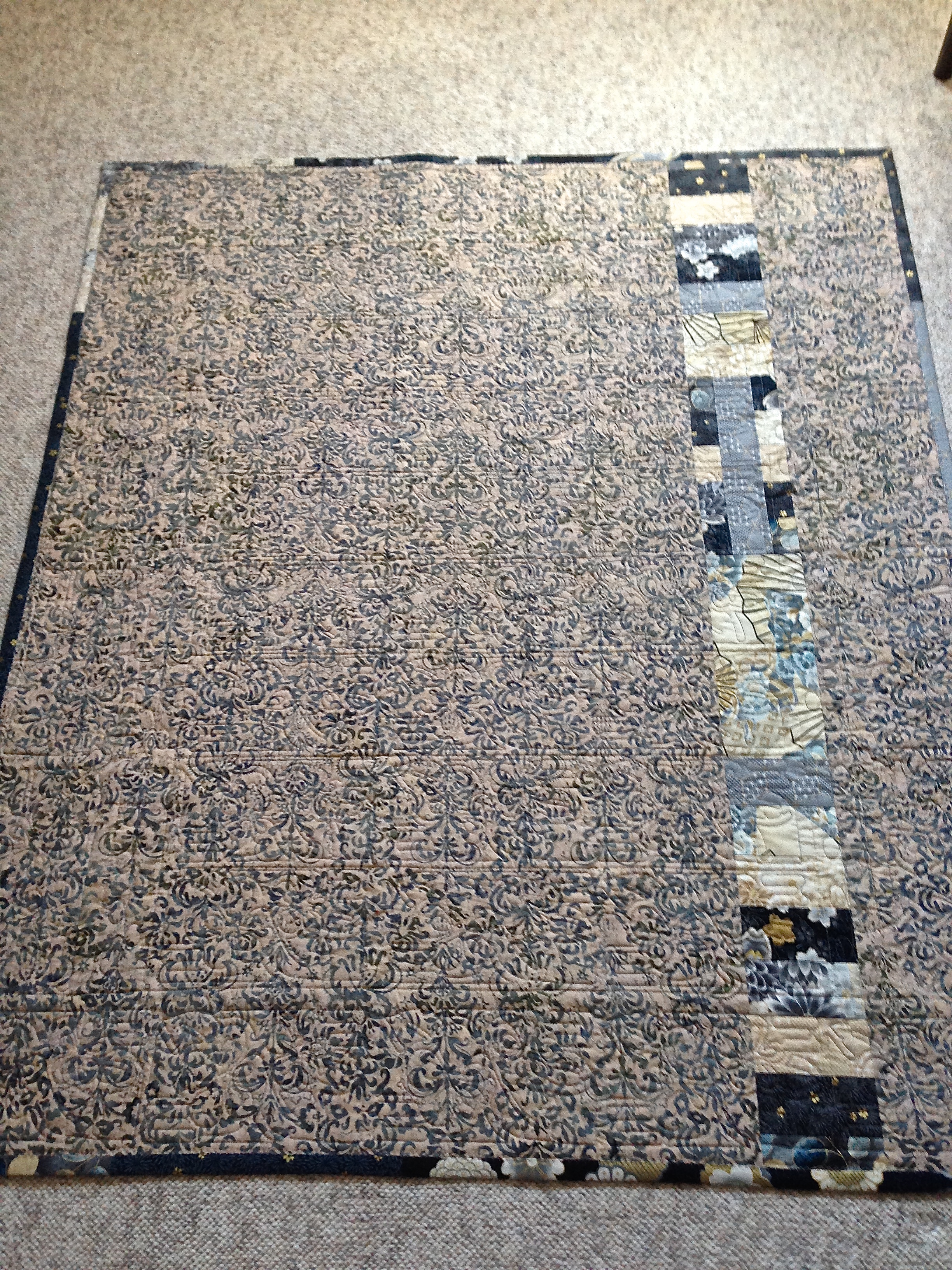 The back of the quilt uses a batik fabric I happened to have in my stash – the right shades to work with the patterns on the front. I needed to widen the back so I added in a strip using scraps from the Kauffman fabrics. There was barely any of the Satsuki fabric left over (just small pieces of two of the lighter fabrics)!