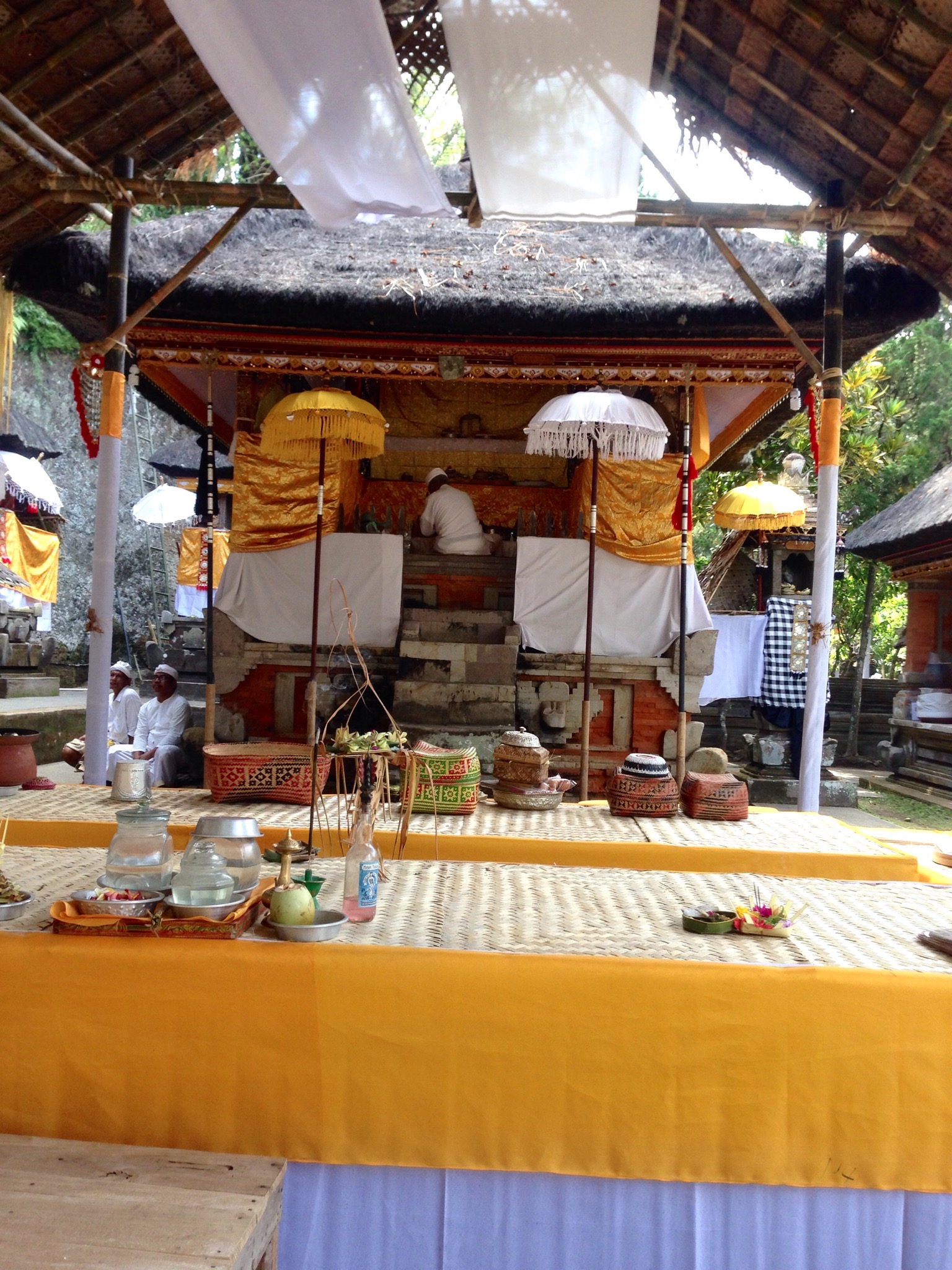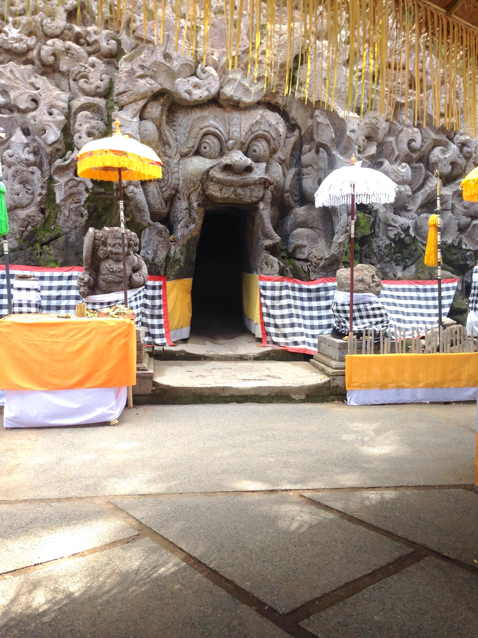 Temples are everywhere in Bali! Only a few are open to tourists. The elephant temple is an ancient temple rediscovered by Dutch archeologists late 1800s. Restored for use after a 1918 earthquake knocked down some of the walls. It’s a small cave and really has nothing to do with elephants. Because there have never been elephants in Bali. There were a number of shrines in use today on the temple grounds – there were people placing offerings at some of them.
