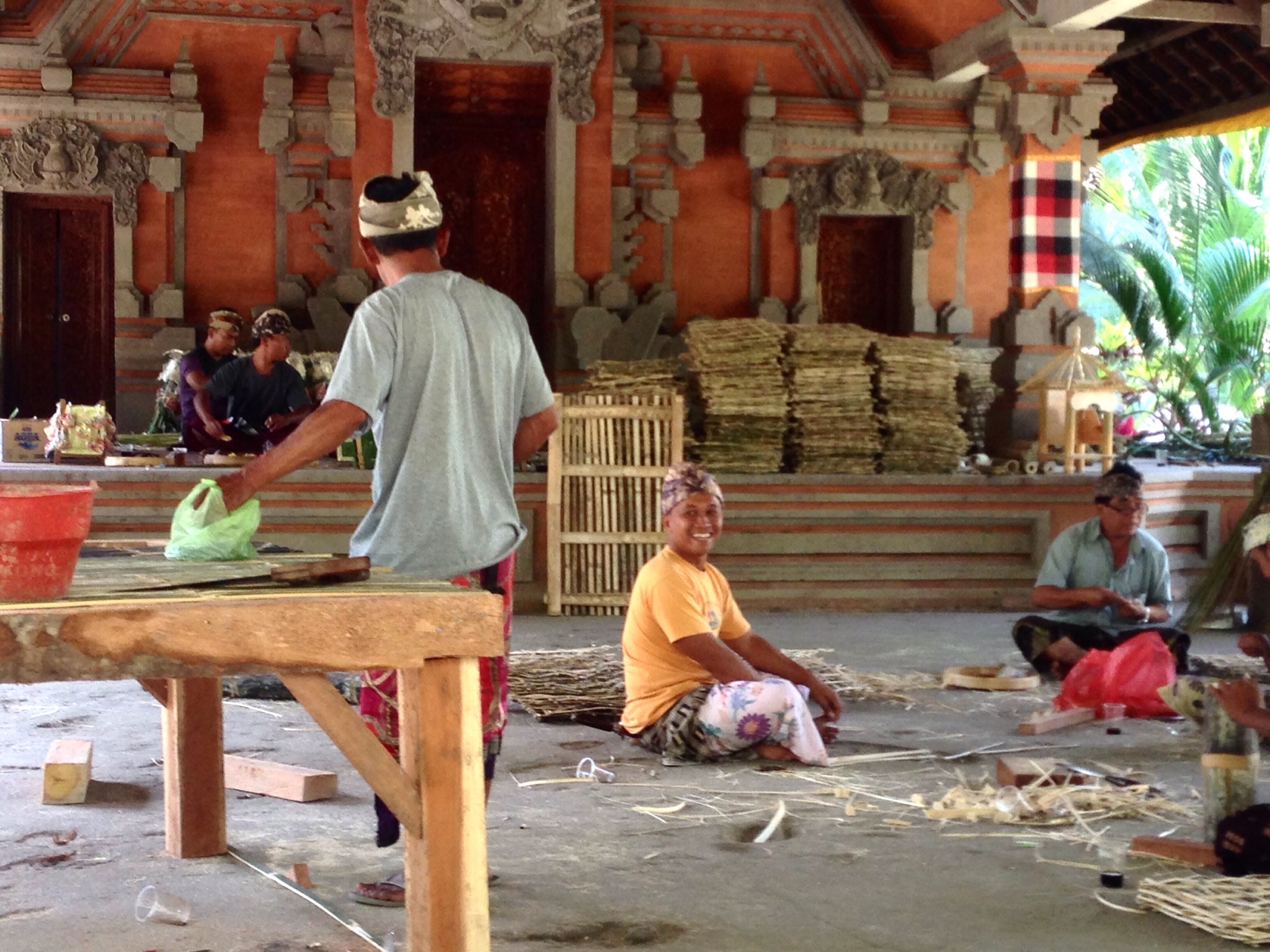 We’ve been hearing about women’s responsibilities, which are many: to shop for food, to cook, to care for children and elders, to prepare the many daily offerings (for many, today, to work as well outside the home). As far as we can tell men have few obligations. Here we see one of them: to prepare the bamboo for the women to make baskets for carrying food offerings to the temple and elsewhere. In today’s world in a good many households these baskets would be purchased ready-made in the market absolving the men from the labour. It really does seem that women bear the burden of keeping Balinese life going.