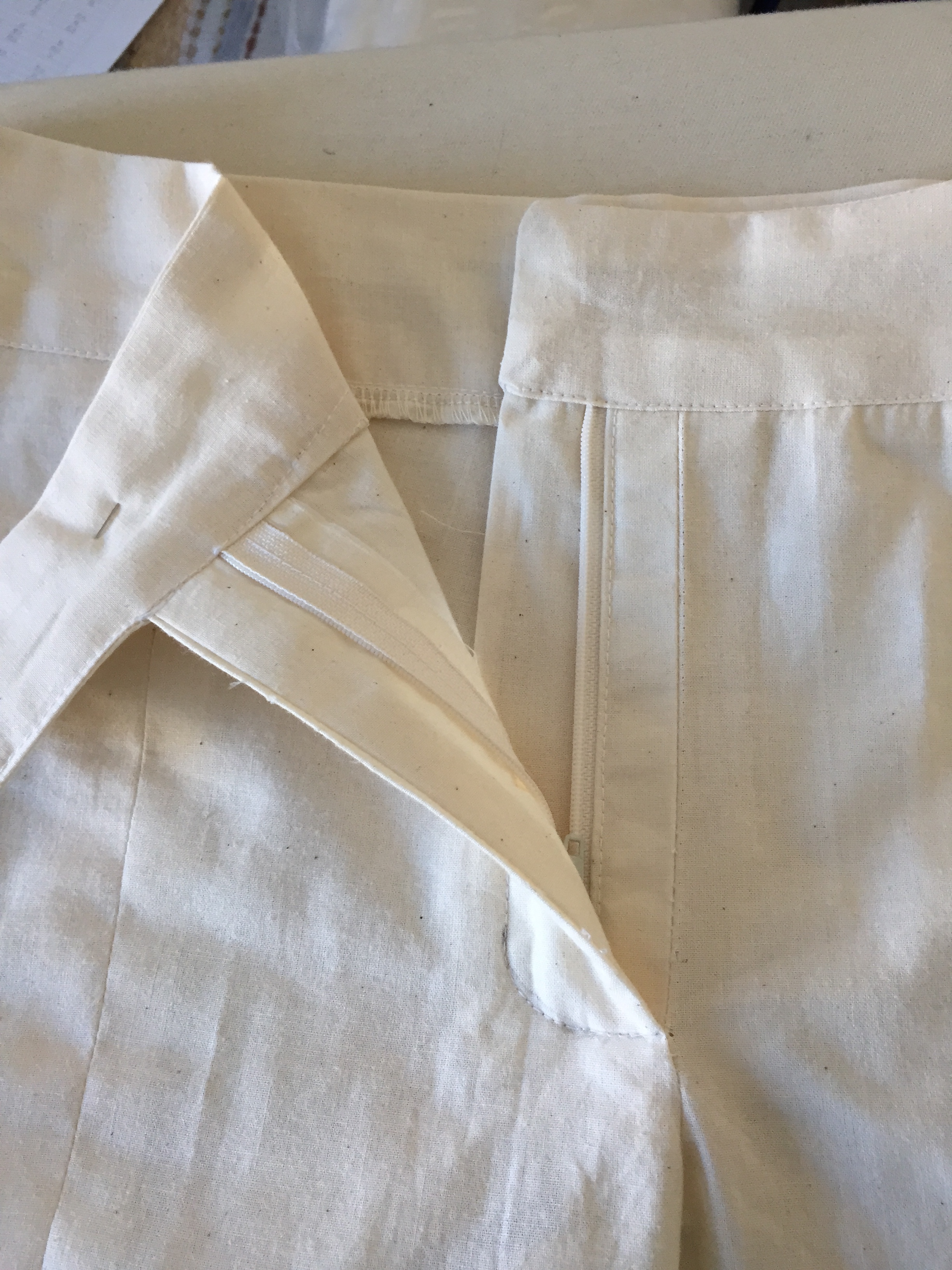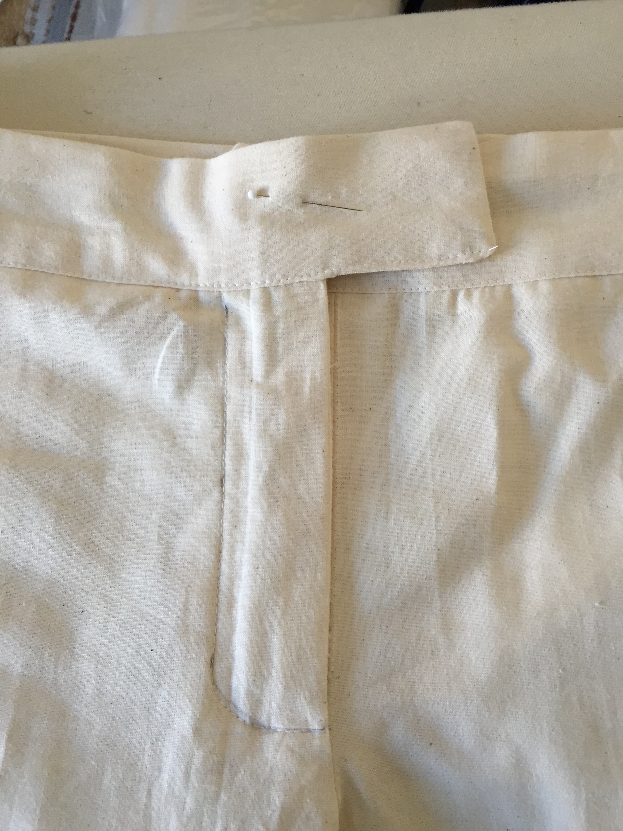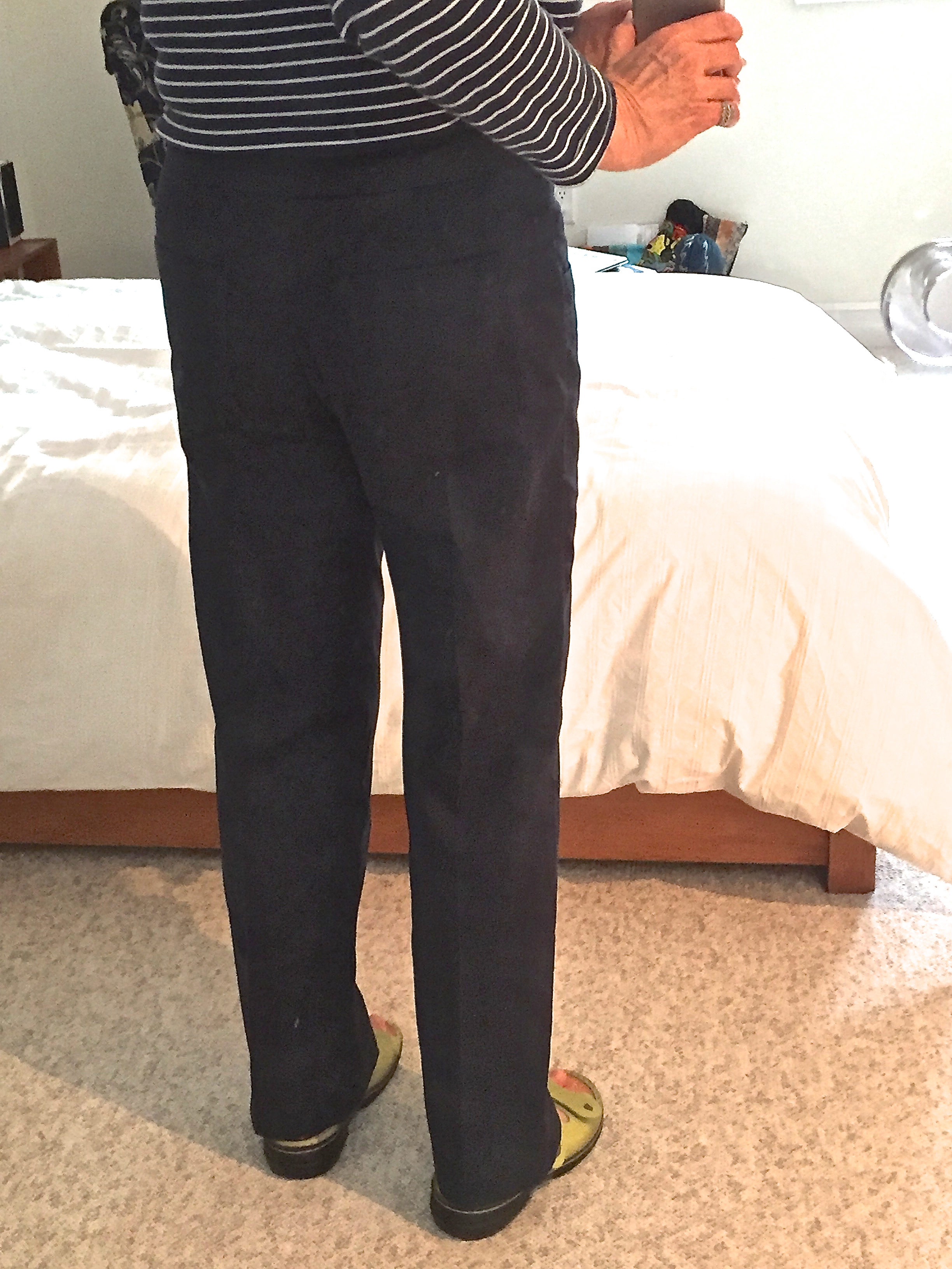 This time, I decided not to use muslin but to make the mockup using some navy twill I had in my stash and if the pants worked (more or less) I’d have an actual pair of pants I could wear. So I narrowed the legs even more (I wanted straight legs that weren’t tight in the thigh or calf but not too loose either). Unlike the previous muslins, I applied pockets to the front and to the back. I went back to the curved waistband on the Vogue pattern and adjusted it to fit my upper hip snugly. And in creating the pattern I incorporated the fly piece into the front panel (I still had to use the fly flap for the back of the fly opening). Just finished the pants this morning. The front falls nicely, no pulling.