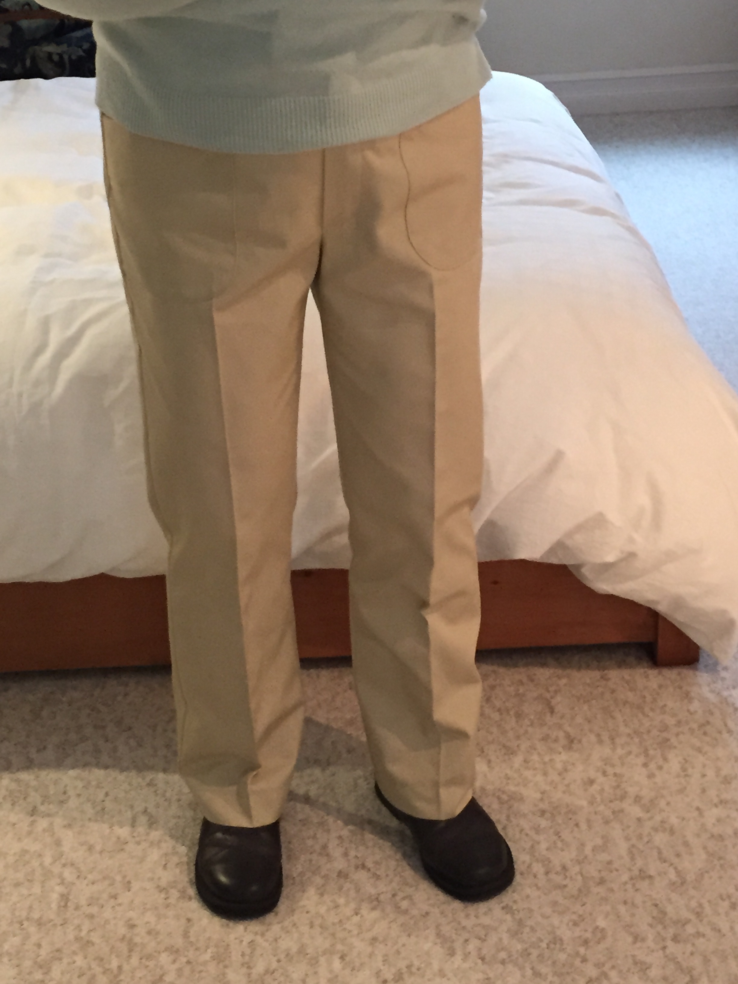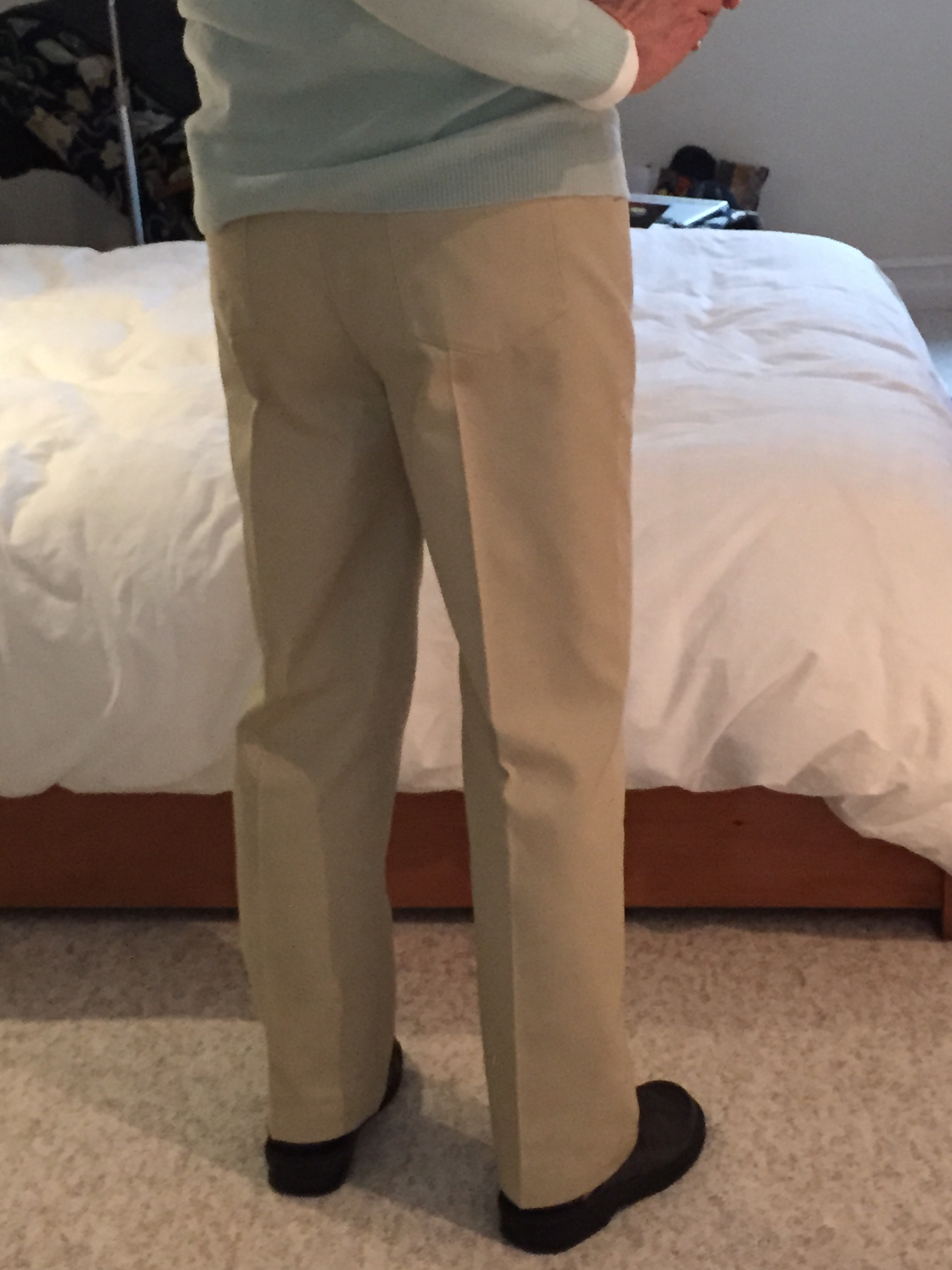 I added pockets to the outside of the front, and pockets to the back. So these pants are a cross between trousers and jeans. I incorporated a tab on the front of the waistband to accommodate an off centre button – (a centred button chews the front of my sweaters – off-centre I’m fine).