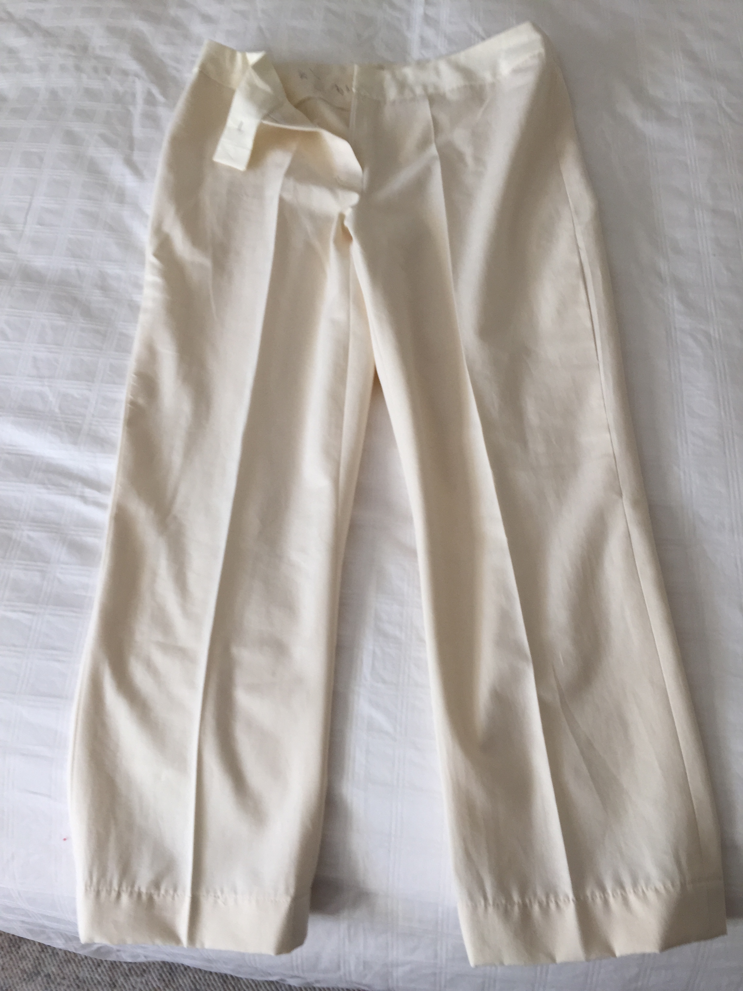 I sewed in a zippered fly front (Sandra Betzina’s technique – I’ll never put in a fly front any other way – this is SO straightforward), stitched up the centre back seam, the side seams, then tried the muslin on. The centre front seam didn’t quite come together – that meant I had to widen the front side seam about 3/8″ on each side. The legs were still a bit full through the thigh – I tried taking them in on the side seam – that introduced some pulling into the back, I put the side seams back and took the leg in on the inner side seam – the muslin still didn’t hang quite right but I had a hunch if I just took a smidgeon from both inner and outer leg when I redrafted the pattern I’d be OK. I marked on the muslin where I wanted the top of the waist to land, subtracted the waistband width (2″), marked that, (then added back 5/8″ to get the cutting line for the top of the pants. I finished the muslin by adding a waistband just to see if I was right about the location of the waistband top edge – I was!