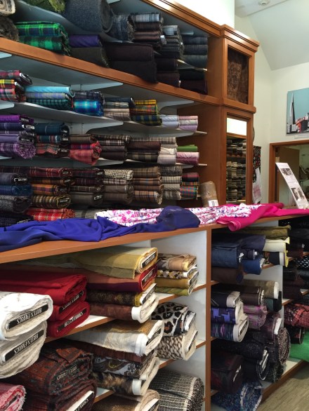 After a leisurely breakfast I moseyed down Mason Street to Geary, made a left turn, walked past Union Square. My destination – Britex Fabrics. You walk in the front door and the entire right-hand wall, all the way to the back of the shop, is filled with wool flannel, worsted, gaberdine, crepe from Italy, England, in an amazing array of weights and colours – and then you check out the price! Not cheap, but the fabrics are lovely, and I’m looking for fabric to make wool pants.
