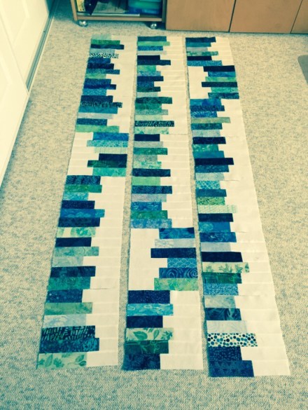 21 blocks done so far. Each block consists of six 2″ strips of a colour joined to a white; making a 9.5 X 9.5 block (finished size will be 9″ square). The strips for the remaining 14 blocks are stacked beside my machine ready to be assembled – this will be a 35 block quilt – finished size at least 45″ X 63″ – that’s without a narrow border which I may do.