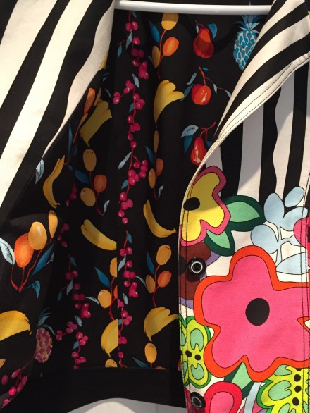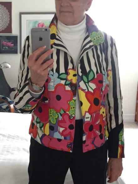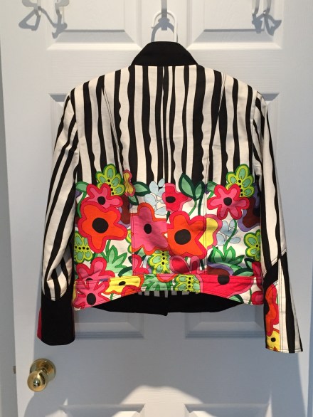 The challenge was the way the fabric was printed – flowers along one side, black and white stripes along the other. Straight off I knew I’d have to cut the jacket with the grain line on the width if I was to get flowers on the bottom and stripes at the top.
