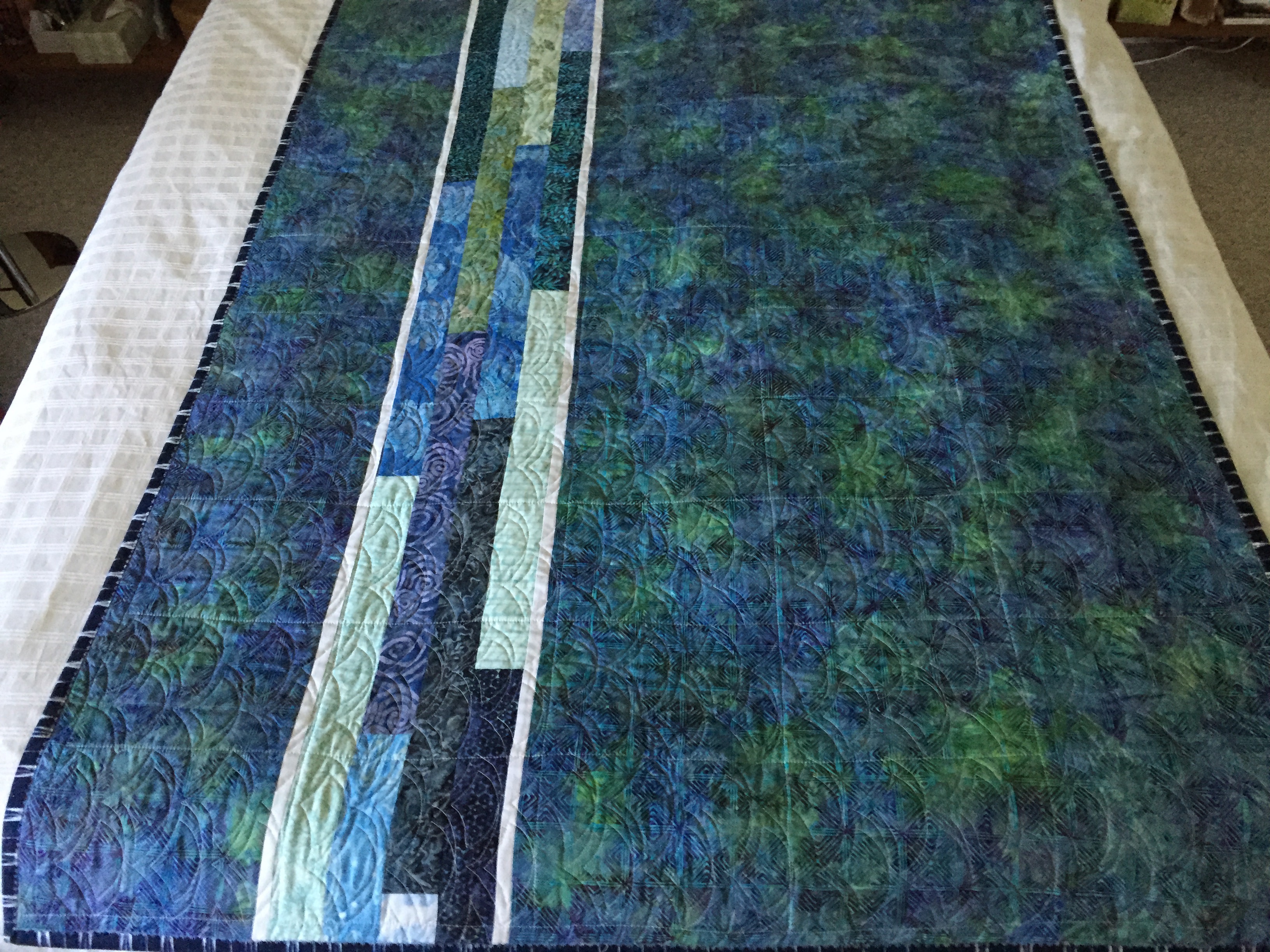 The idea for this quilt came from a pinterest photo a friend sent me a while back. I liked the idea of just creating blocks from strips of variable length with a background fabric. I had a jellyroll of blue batiks and lots of scraps in blues/greens. I’m guessing the pinterest original likely used 2 1/2″ strips but that would yield blocks too large for me to embroider in the hoop, so I reduced the strip width to 2″ (which meant cutting 1/2″ from the jellyroll strips) and created 9 1/2″ blocks of six strips each.