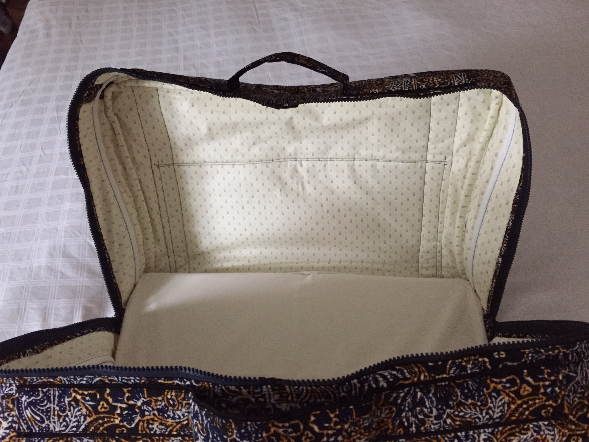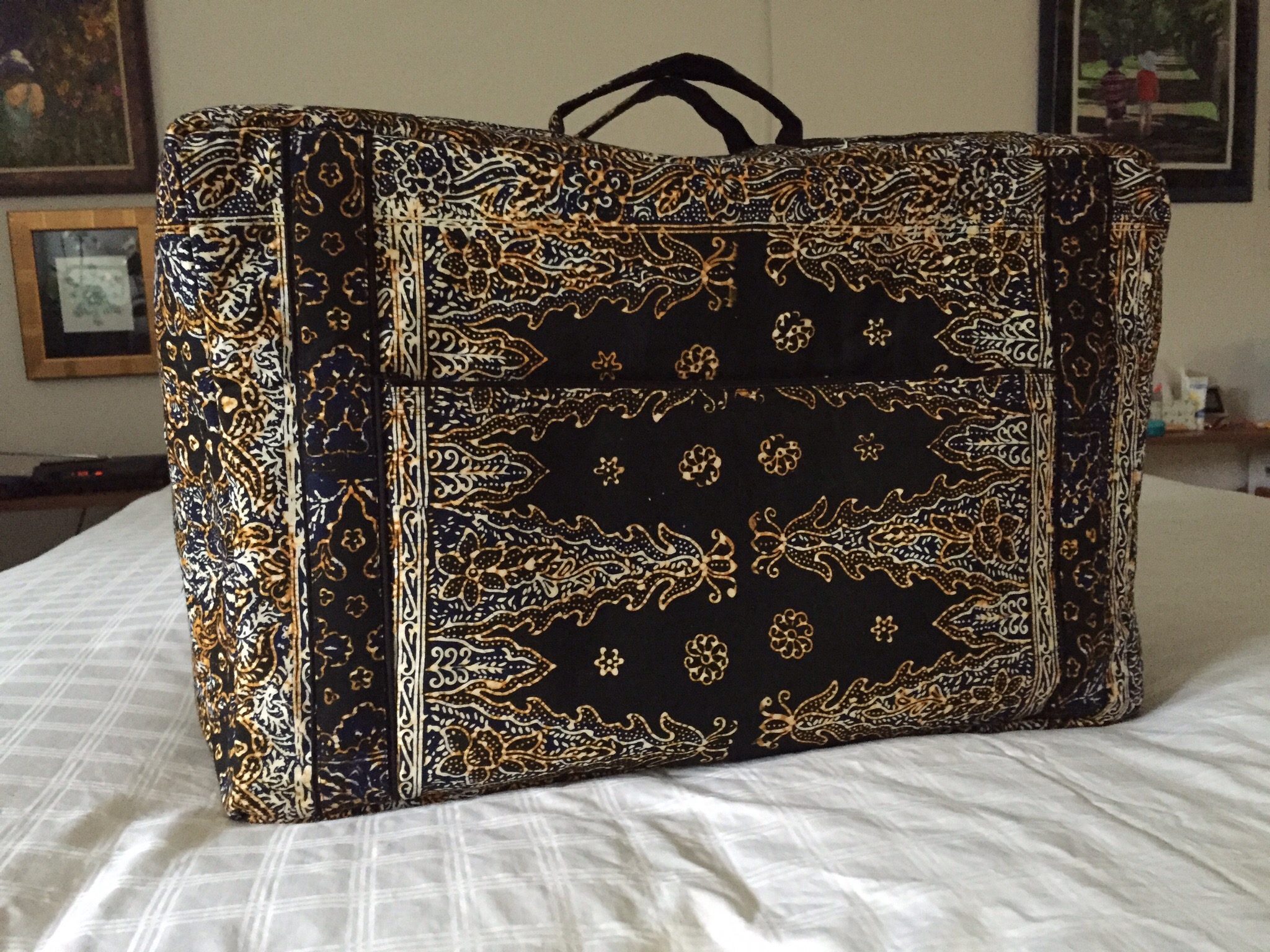 I’ve made lots of tote bags and even a weekend bag (too big to be a carry-on), so this would be relatively straight forward. I chose some fabric from my stash for the outside as well as the inside, cut out sides, ends, top and bottom, and strips for binding and assembled the bag complete with a zippered compartment on one side.