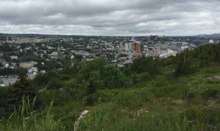 The coastal fog was rolling into Cape Spear late this morning. It lifted enough for me to get a shot of the lighthouse – the most easterly point in Canada/North America! From there you could see fog in St. John’s harbour (Signal Hill in the distance):