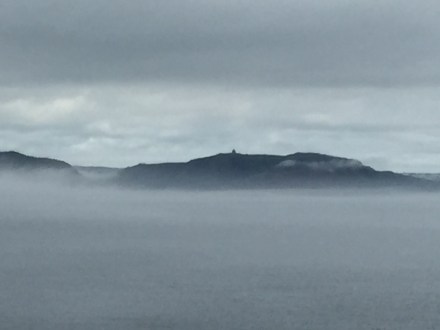 The coastal fog was rolling into Cape Spear late this morning. It lifted enough for me to get a shot of the lighthouse – the most easterly point in Canada/North America! From there you could see fog in St. John’s harbour (Signal Hill in the distance):