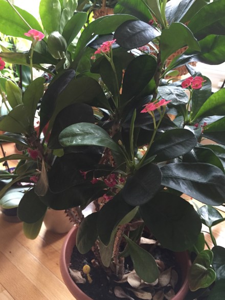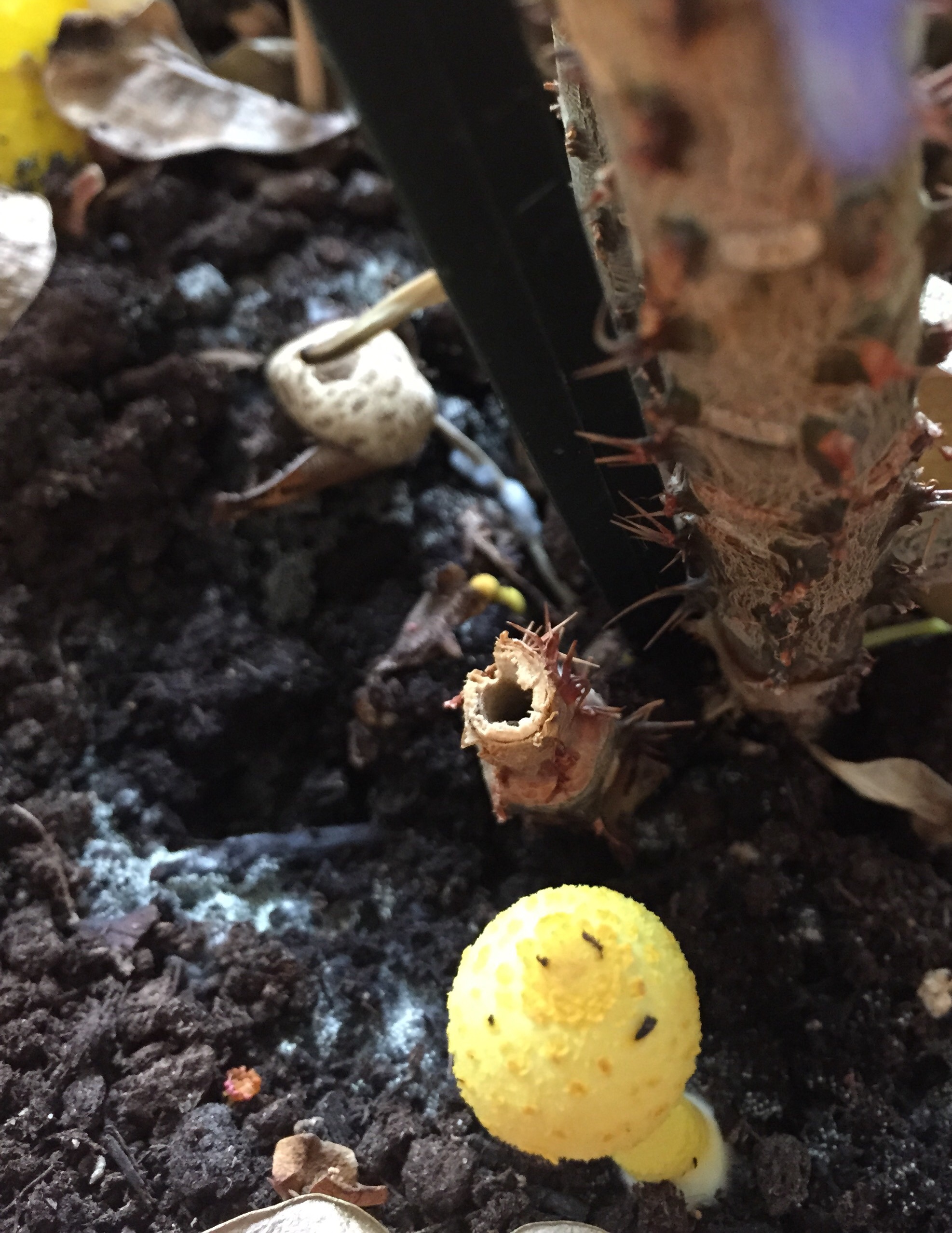 Well, this was a surprise this morning! Little yellow mushrooms in the pot with the crown of thorns. So I take a closer look, then google to see what’s growing – I have Leucocoprinus birnbaumii, the yellow houseplant mushroom!