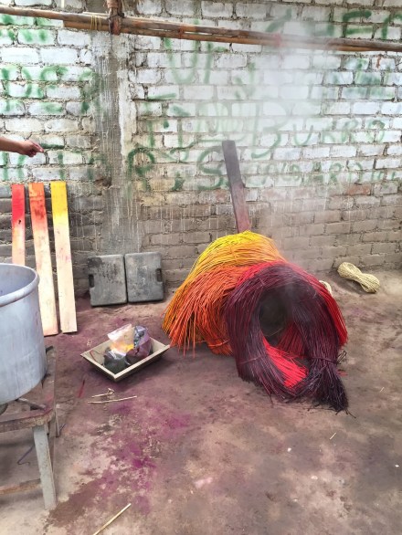 The artisan took us through his process for dying the reeds – first yellow, then pale orange, stronger orange, red, and last magenta. After each successive batch of reeds was placed in the boiling dye vat, stirred like spaghetti and lifted out, he added a bit more aniline dye to the dye mixture before adding the next bundle of reeds. It wasn’t long before he had an array of strongly coloured reeds he could use for the baskets.
