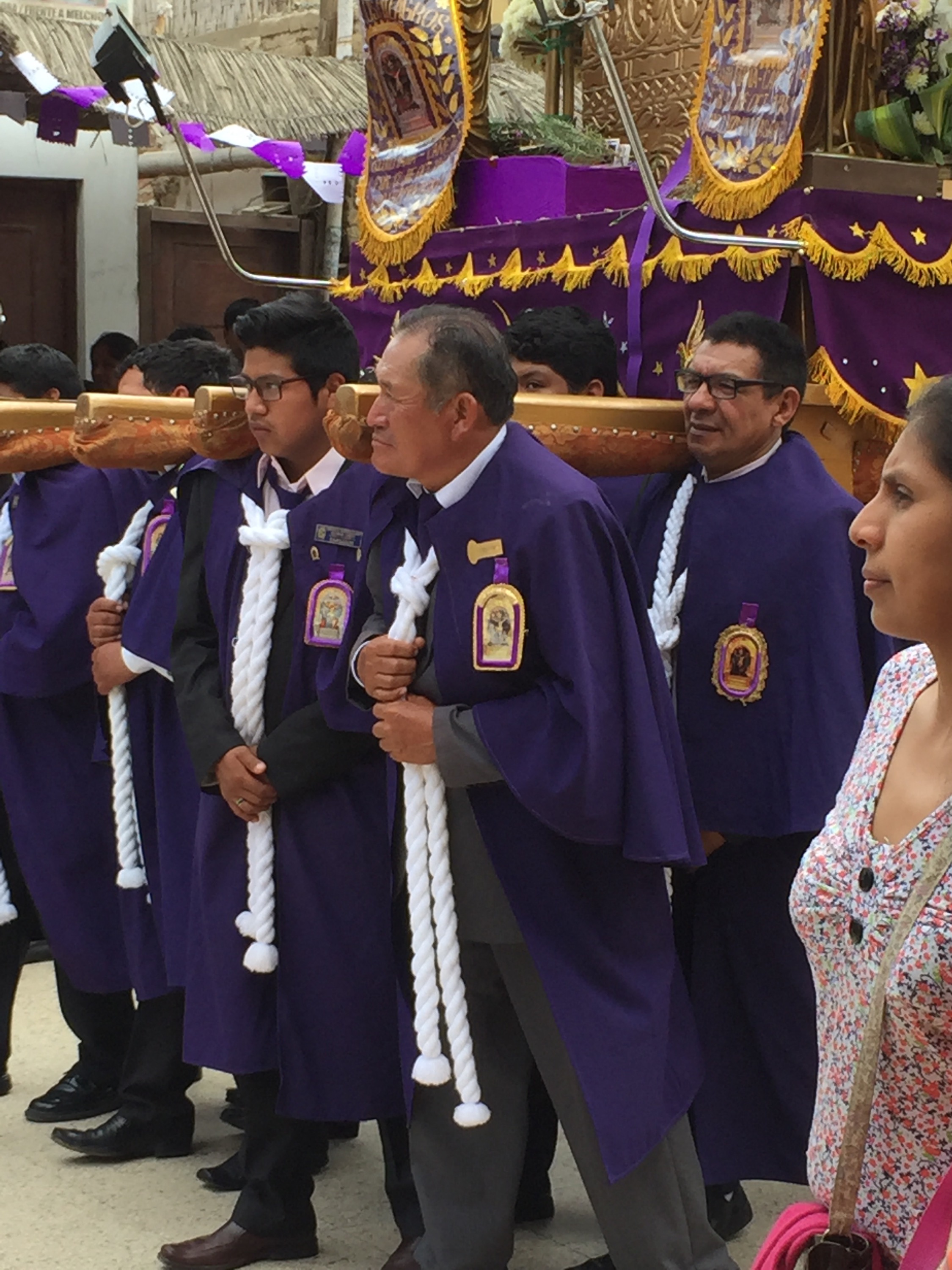 Our first stop was Chincha to visit a basket weaver. On our way to his workshop we encountered a religious parade replete with a shrine being shouldered by teams of young and old men in purple robes with white rope neck ties supported by a marching band.
