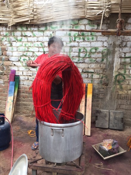 The artisan took us through his process for dying the reeds – first yellow, then pale orange, stronger orange, red, and last magenta. After each successive batch of reeds was placed in the boiling dye vat, stirred like spaghetti and lifted out, he added a bit more aniline dye to the dye mixture before adding the next bundle of reeds. It wasn’t long before he had an array of strongly coloured reeds he could use for the baskets.