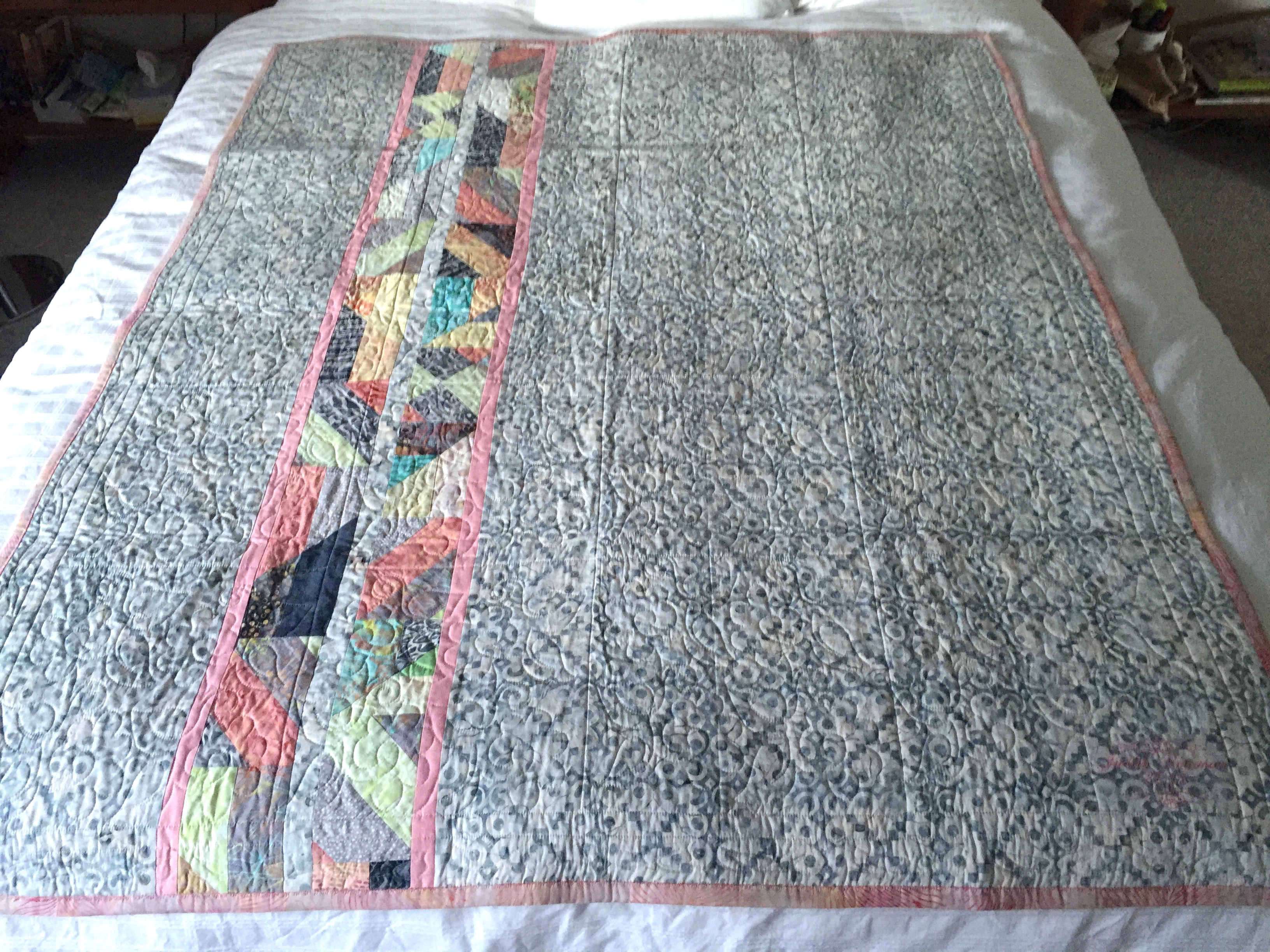 Because these are not colours I’d usually use I wasn’t sure what to do about borders and backing. In the end I chose to highlight the peach tones and the dark grey on the top, and bring out the lighter greys on the back. The inserted strip is constructed from the small pieces of leftovers – fortunately there was enough to create the strip length I needed.