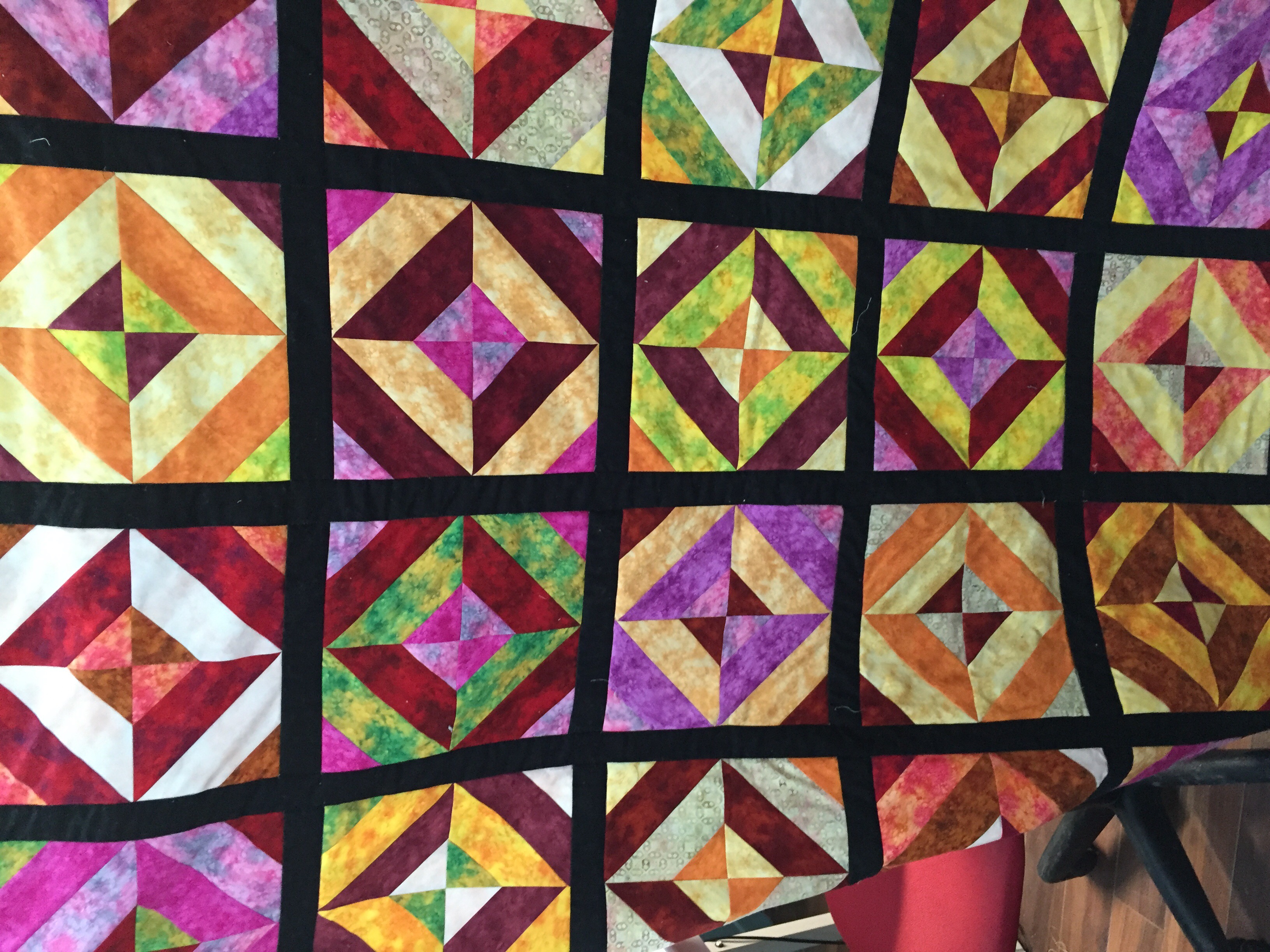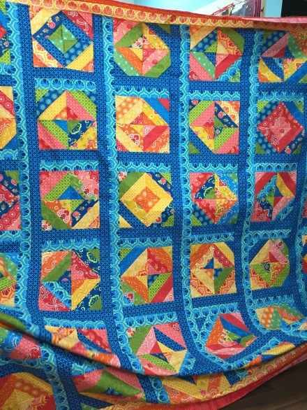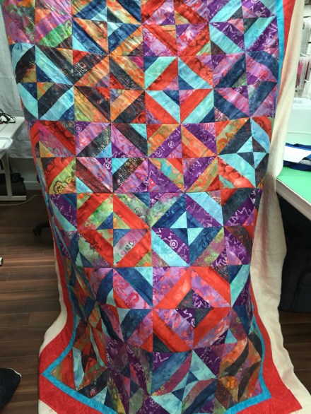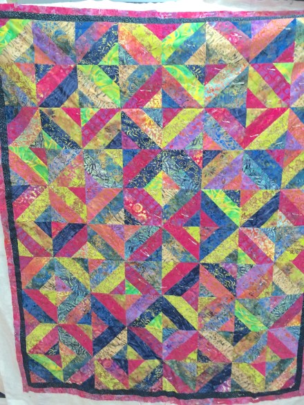 I wasn’t sure about the bold batik I used for the back – whether it complemented the insertion or not, but now that the quilt is completed I’m happy with the result.