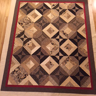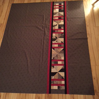 One of the things I wanted the ladies in the quilting class to learn was how to look at pictures of quilts and deconstruct them. So I hunted for quilts I thought would be relatively easy to analyze. Among the photos I sent them was a charm quilt. “Charms” if you don’t know are precut pieces of fabric 5″ square. I had several charm packs (a charm pack is 40 of these 5″ pieces) in my stash and thought I should give the quilt a try. The original photo sashed and bordered the charms in alternating darker and lighter grey. I took my charms to the fabric store to see what would work with the charms I’d selected. Dark and light grey for the sashing was going to make those small coloured blocks pop. So I cut the strips I needed and quickly assembled the quilt top. What I particularly like are the vertical strips from one row to the next linking the rows.