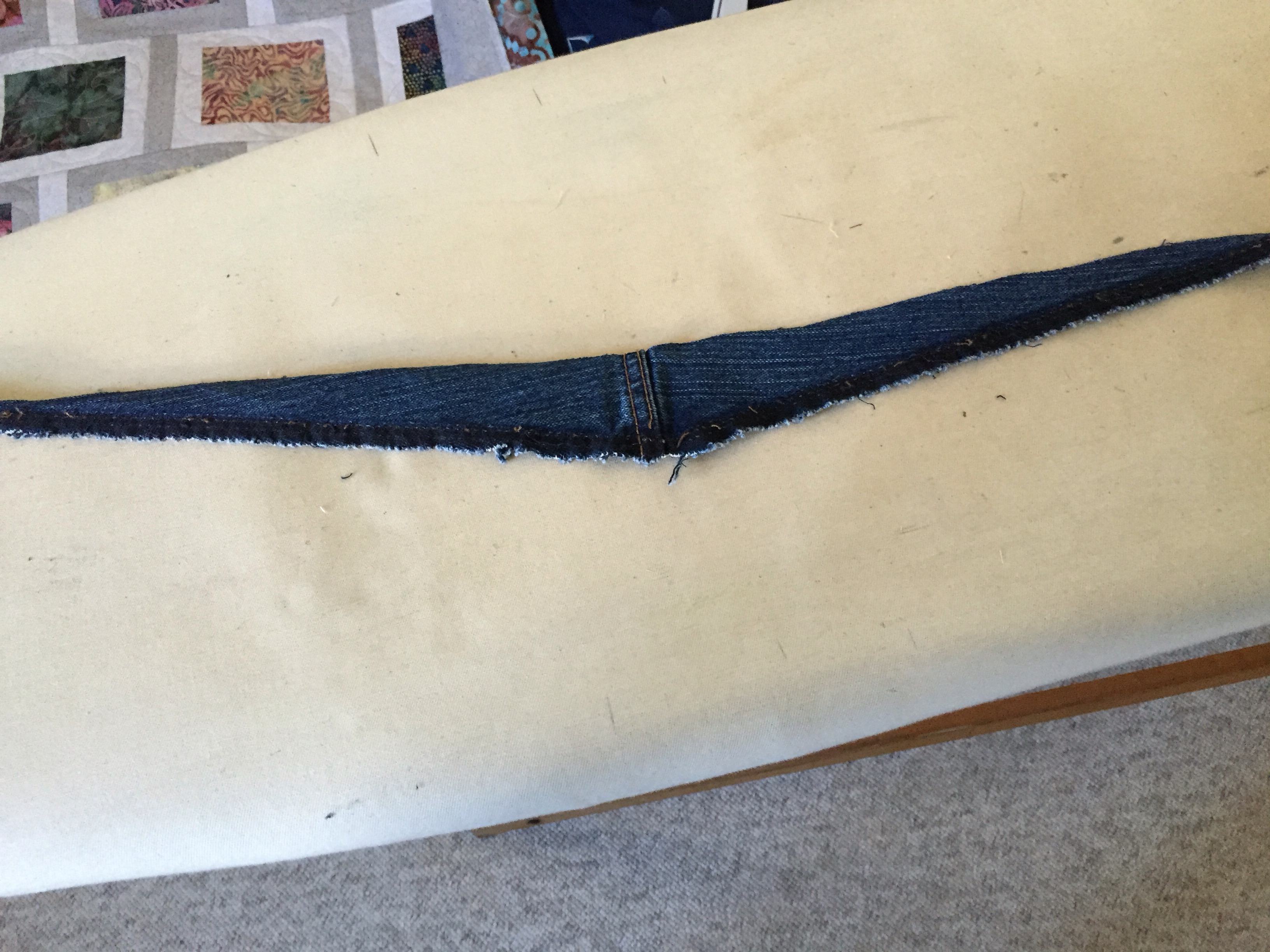 I open the inner leg seam from knee, through crotch, to knee. I pin, then straight stitch, front to back through the crotch making sure I am cutting out about 2 1/2″ at the back crotch seam area tapering the alignment along the inner leg till the front and back match at the knee – I don’t cut anything at this point because I want to check fit before cutting. The fabric eventually removed from the back crotch and back inner legs looks like this – sort of triangular.