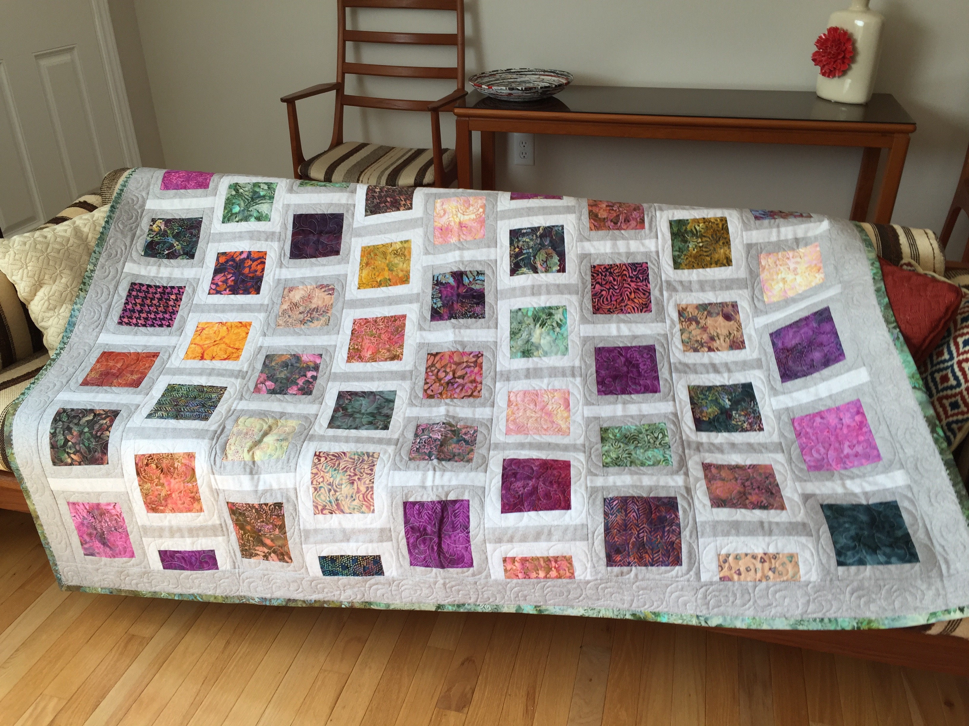 Just done. Label and all. I’m pleased with how the quilt turned out. I like the contrast between the two muted background fabrics and the individual swatches – each is strong and colourful, yet they blend well.