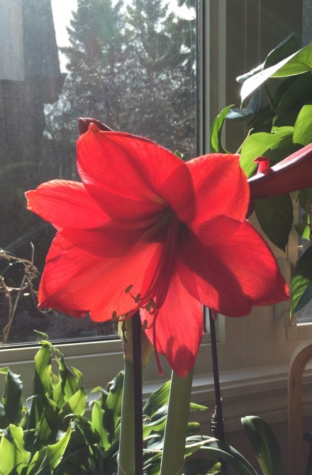 Finally my amaryllis is blooming. I potted the bulb as soon as I got it at Christmas, watered it sparingly – and finally it’s got flowers. It’s a double (the second stalk will be in flower in a few days). So I may actually have eight flowers at the same time – wouldn’t that be grand.