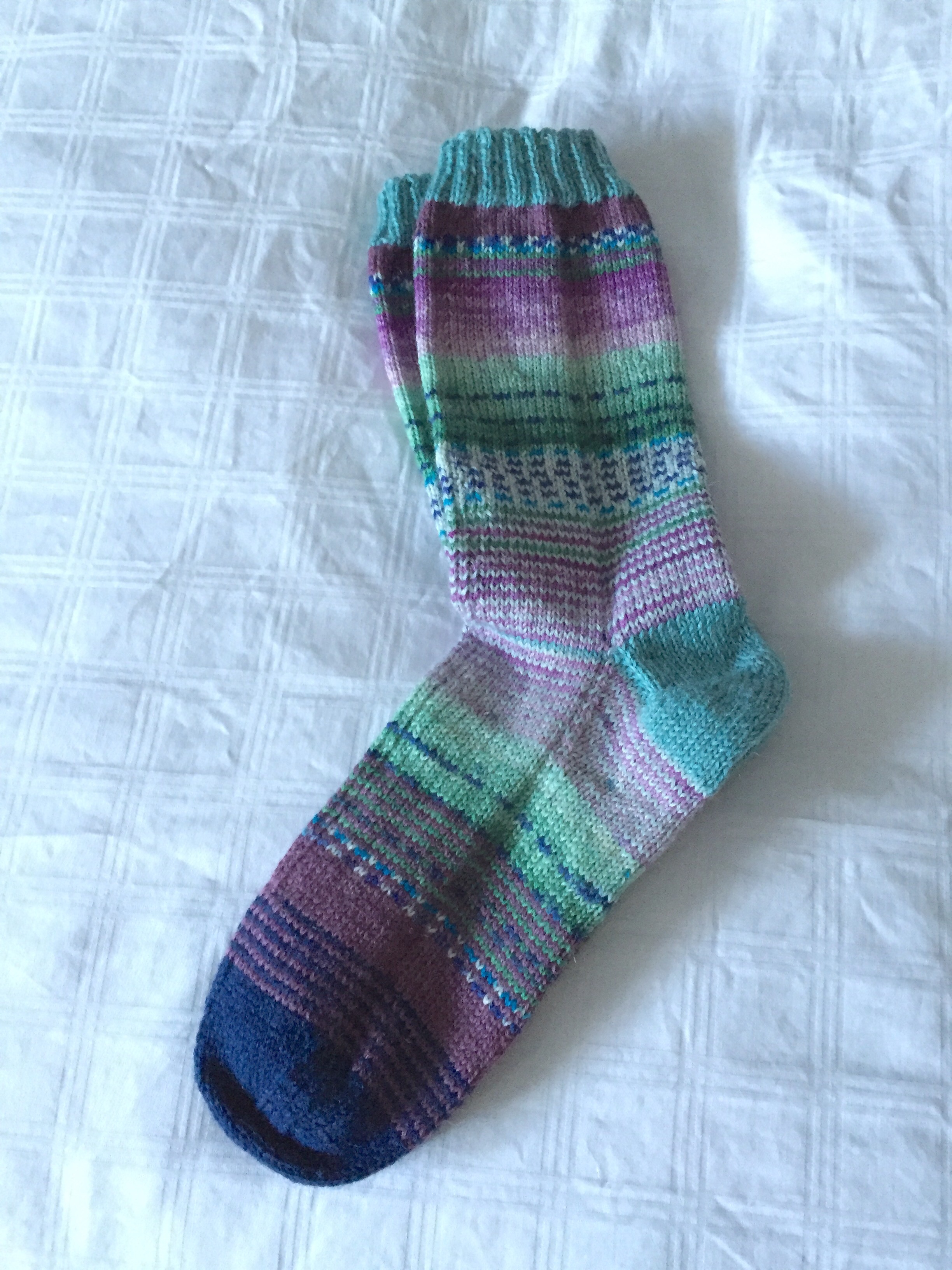 Finished this pair of socks from leftover bits of yarn. I find I enjoy turning those bits of yarn into something that’s even more interesting than some of the variegated patterned yarns.