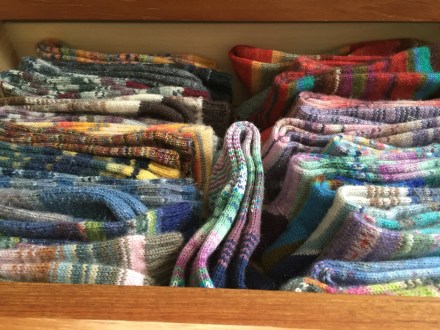 I’ve been knitting socks for myself and others since 2003. So far I’ve probably knit about 350 pairs of socks – of which I have 42 pairs in my sock drawer, including the latest pair I finished last night.