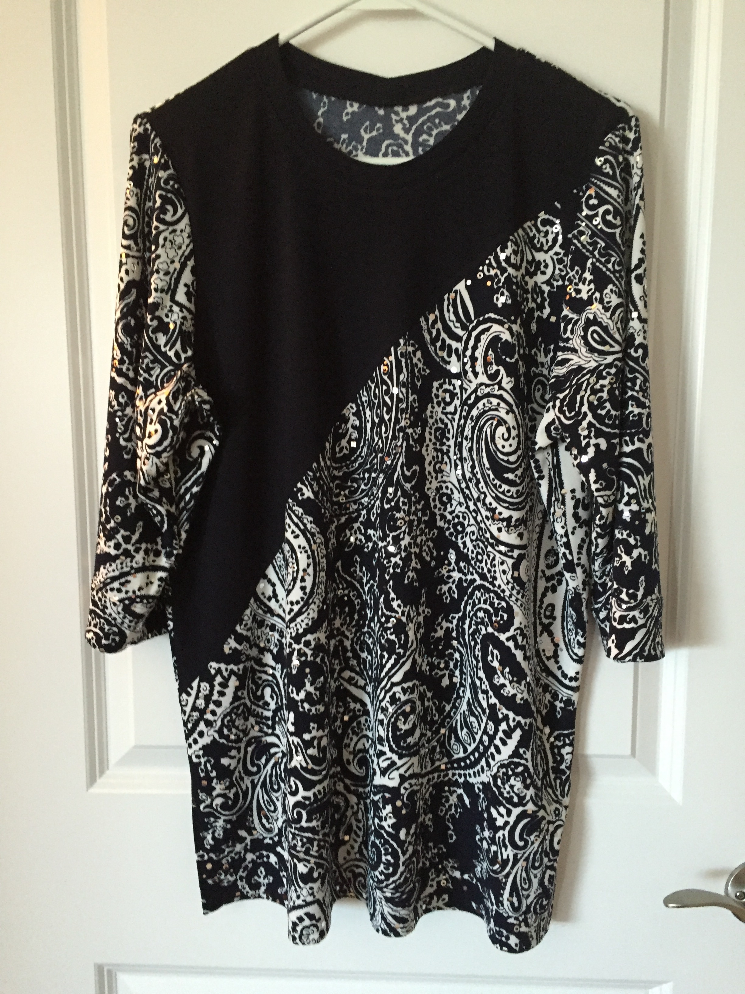 Then a second tunic top. Again, I was short on fabric, but this time rather than use the black ITY knit, I had enough fabric to piece the sleeves with a center seam from shoulder to cuff (if I hadn’t mentioned it you likely wouldn’t notice it when I have the tunic top on – and the seams in the sleeves lined up perfectly with the shoulder seams!)