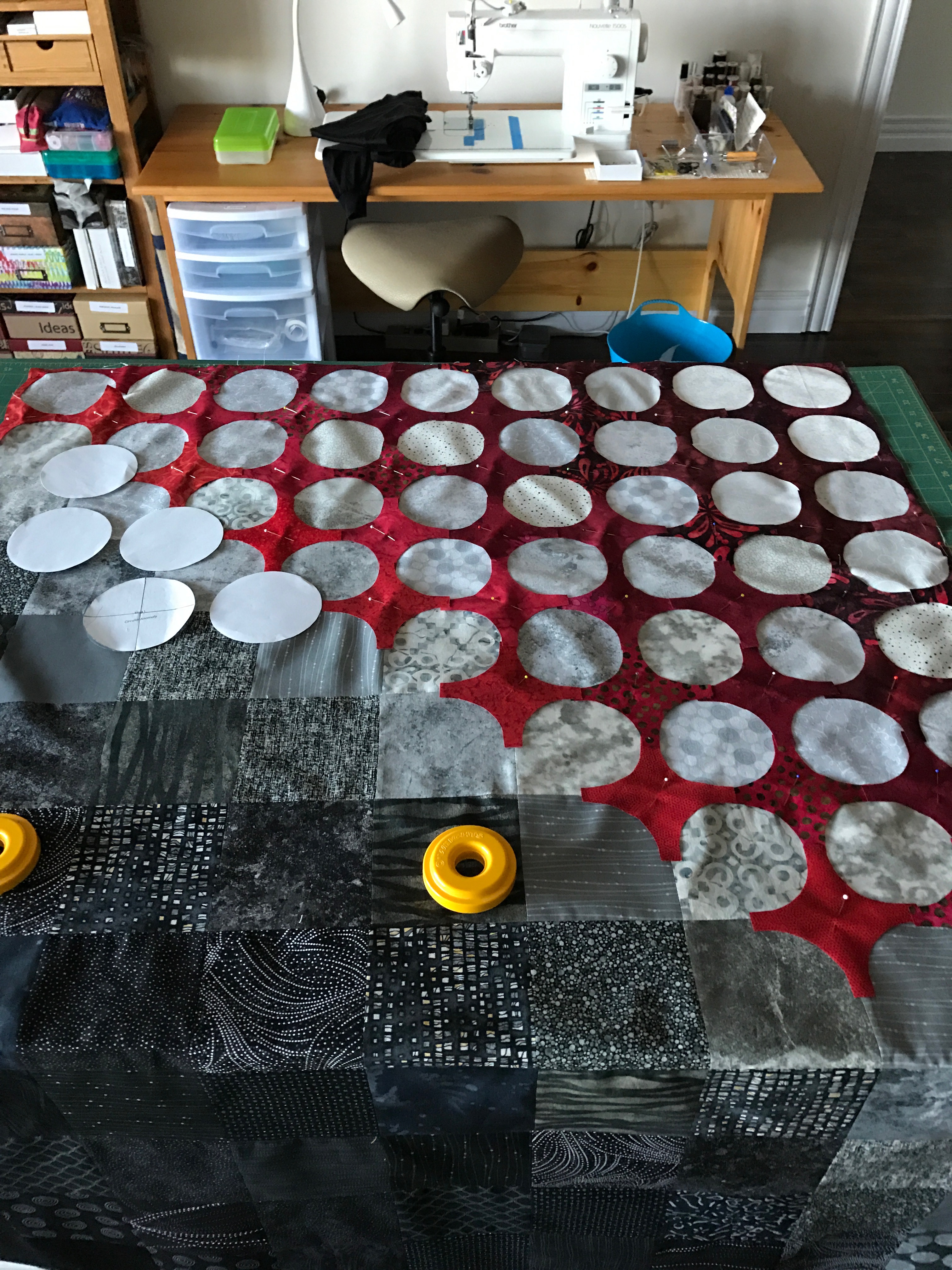 I cut 4 1/2″ strips of “Wonder Under” – Pellon’s 805 light weight fusible paper backed iron-on adhesive, drew the circles and “X”s on the paper side of the strips, then fused the strips to the back of the red fabrics. So far, I have carefully cut out the “X”s and pinned them to the background being careful with the colour gradient from dark in the right top corner to medium red along the diagonal :