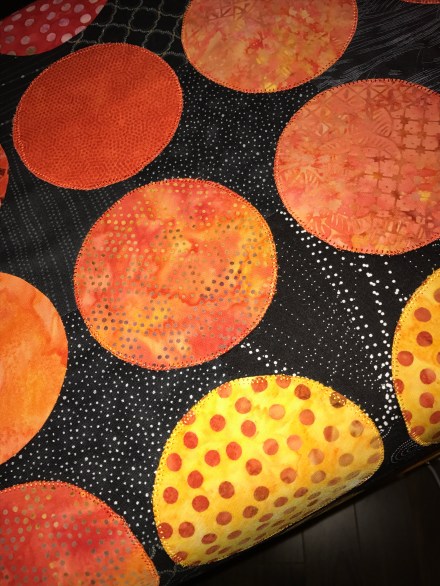 Once the top stitching is done, have to think about some kind of quilting to hold the top-batting-backing together. The design does call out for some kind of stitching within the circles and the “X” pieces rather than an all-over quilting design but I haven’t yet figured out how to do that – I want to try hooping the quilt as 9″ blocks (4 background squares at a time) and embroider within the circles and “X”s. I will have to see what single-run design I can come up with to fill the positive and negative spaces in an interesting way.