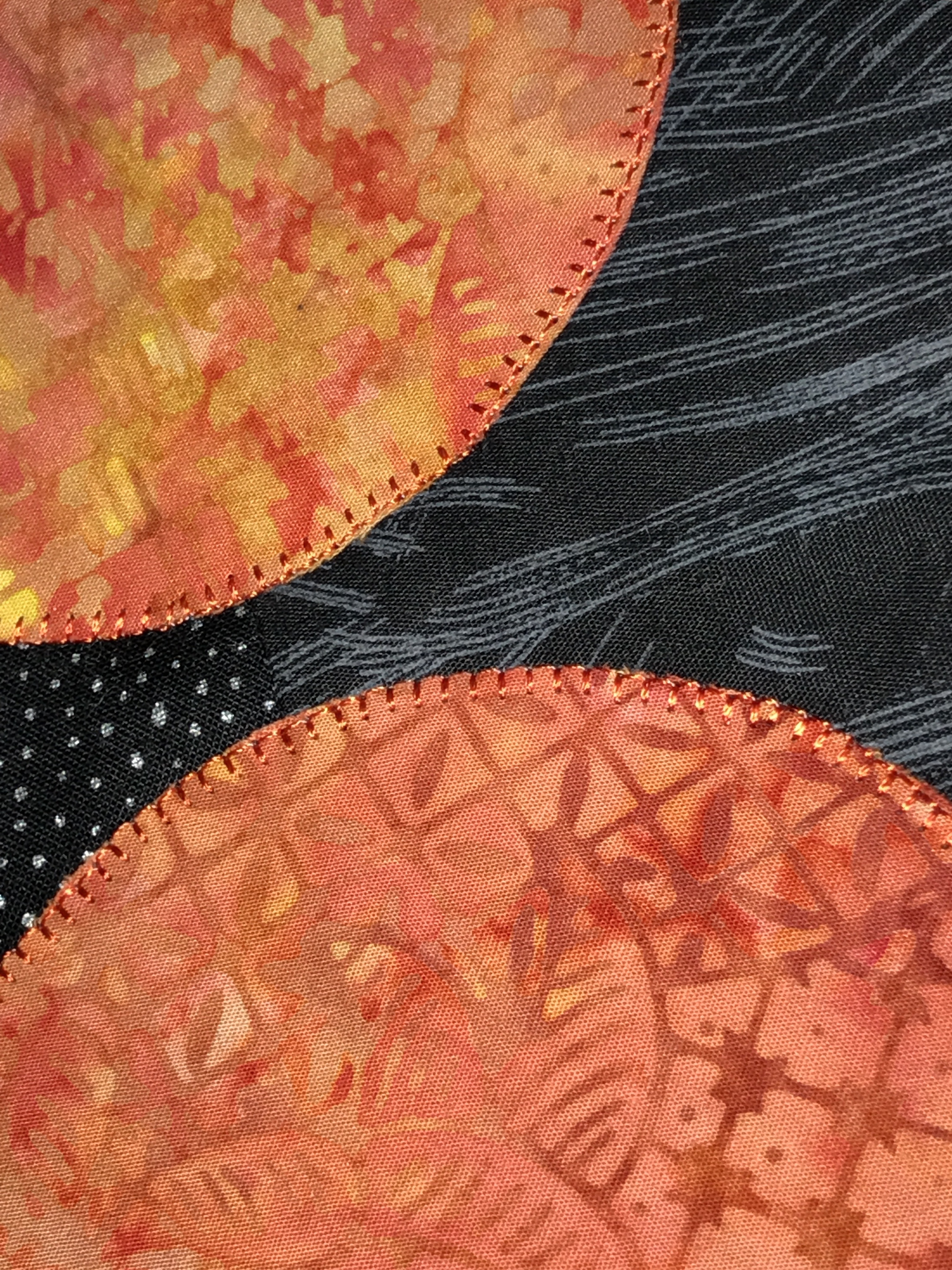 Next step: carefully fuse the X-shaped pieces to the background before creating and cutting out the circles. I’m aiming for asymmetry here, so there will be more circles than “X” pieces. Once all the pieces are fused in place I will need to edge stitch them to the background. To do that I’m intending to cut my batting and apply and pin it beneath the background to bypass the interfacing step. The batting will provide enough stability (the cotton sticks to it nicely) that I should be able to control the stitching process. I’m planning to use a small blanket stitch rather than satin stitch which I think will be heavier than I want (Smith did use a satin stitch in her quilt).