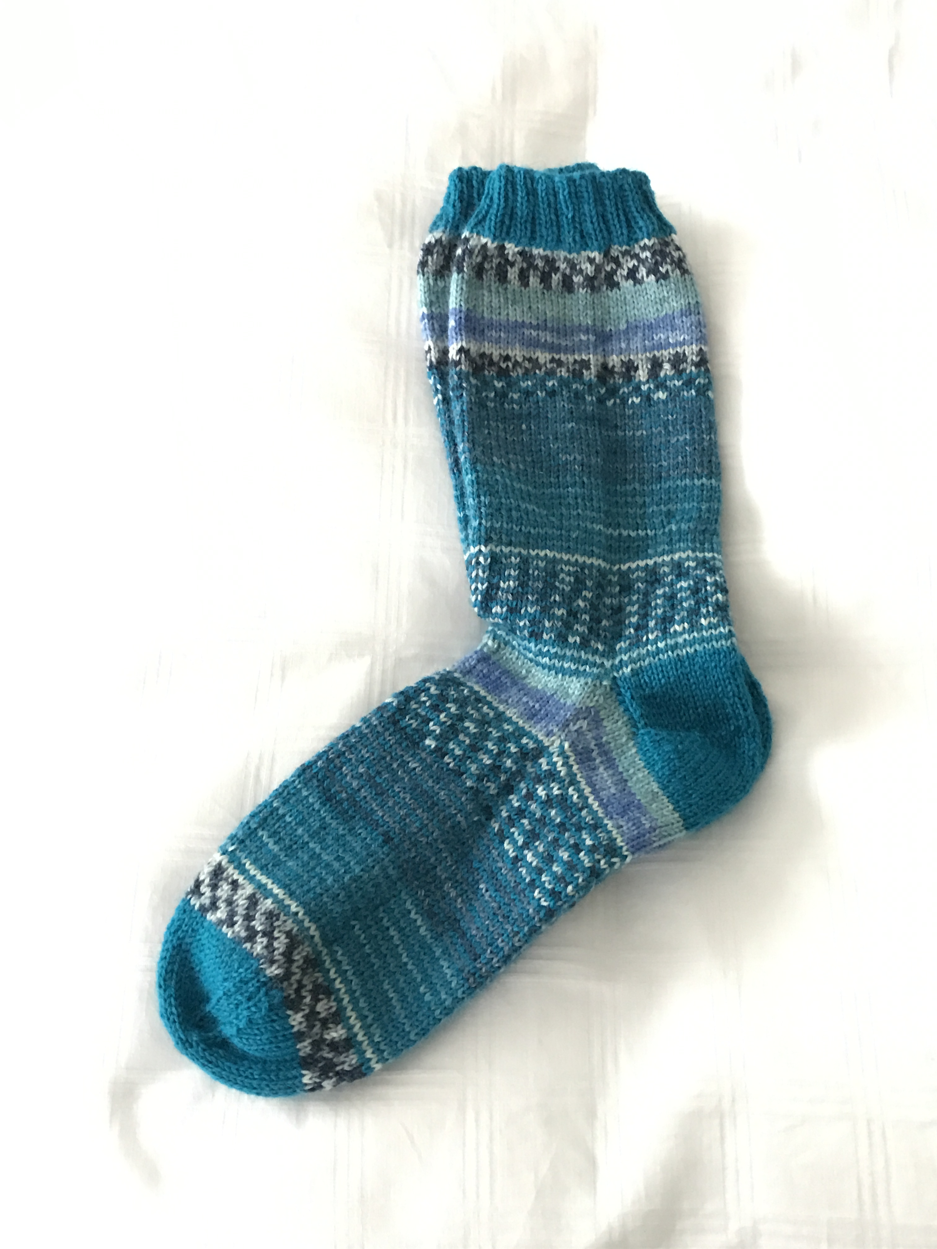This is the pair of socks I finished last evening. I had only a single 50g ball of the variegated yarn so I extended it using a complementary turquoise. In this case, most of the sock was knit with the two yarns interleaved.