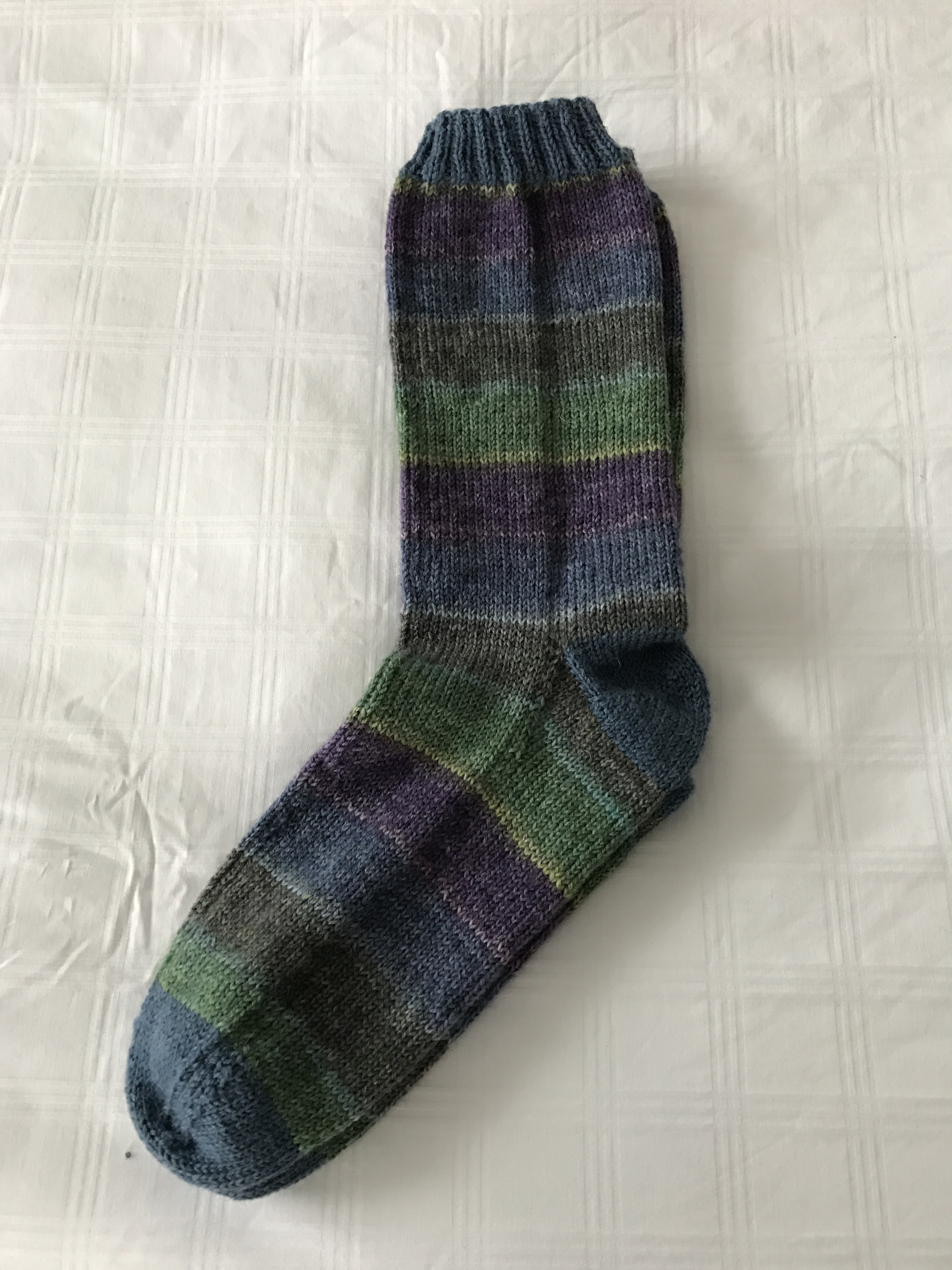 Thank goodness, this is the last of that lovely, but boring, yarn I bought last summer. The yarn had a great feel was nice to work with, but Oh! it was dull to knit with. Not much change in colour – the socks seemed to take forever.