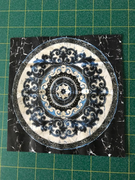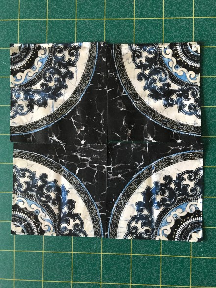 The single drunkard’s path block here balances the center – and the blue marble is almost right. If I had only bought a second medallion panel! Then I would have had more printed fabric with which to work. I’ve looked online but there is none of this fabric to be had (a few background bits of the brown colourway but no blue anywhere). So I’ve got to improvise.