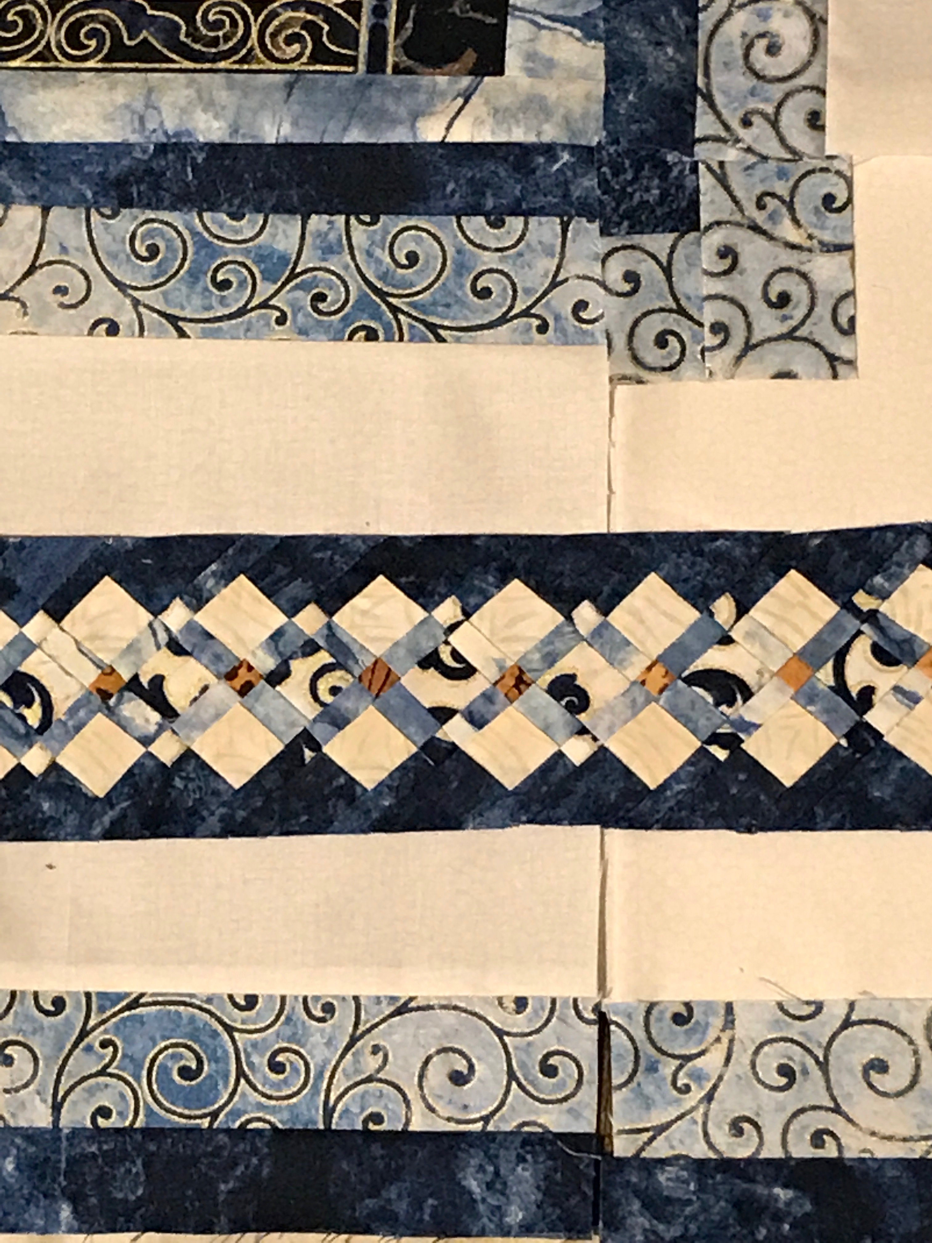 I particularly liked the middle strip and decided to try it. My fabrics are on the heavy side so accomplishing this piecing when I want to end up with 1/4″ blocks has required quite a bit of careful piecing and pressing. I wanted to bring in a hint of the orange/golden colour which I was able to do. I also wanted to use the white/blue scroll fabric, which I also incorporated. So here is the sample strip; now to make seven more!