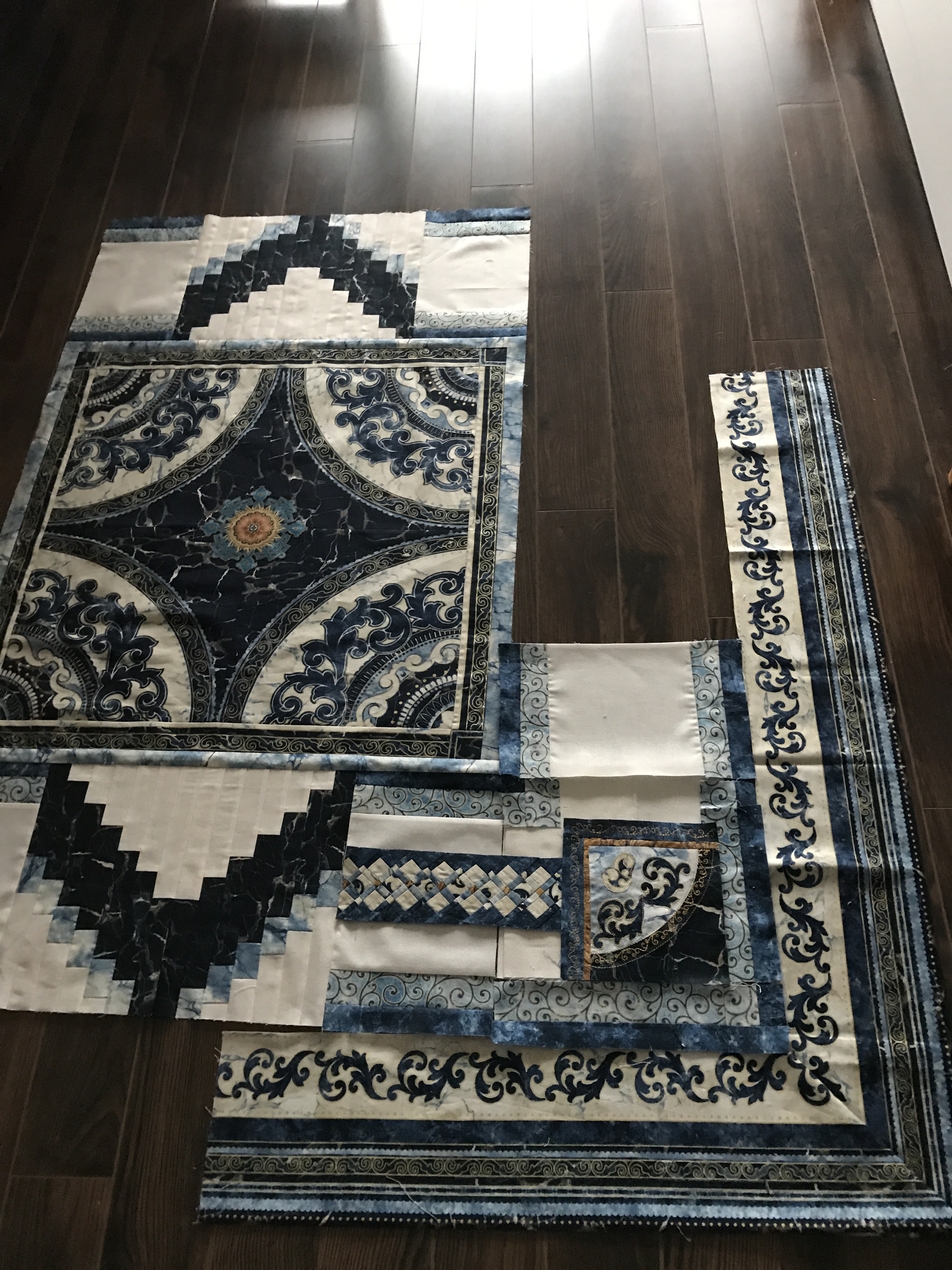 The single drunkard’s path block here balances the center – and the blue marble is almost right. If I had only bought a second medallion panel! Then I would have had more printed fabric with which to work. I’ve looked online but there is none of this fabric to be had (a few background bits of the brown colourway but no blue anywhere). So I’ve got to improvise.