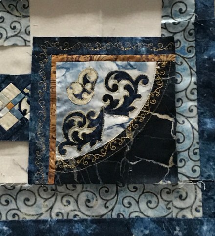 The dark marble fabric is fine, but I have to do something with the lighter blue – I think the tone of the blue works, but the fabric doesn’t have quite enough detail to balance the rest of the quilt. Maybe this is a place where I might try some machine embroidery, perhaps even using an orange/golden rayon thread, to add detail to the blue marble. I’d piece it, if I could but think of a way to do something based on the quarter circle, but at the moment I can’t see what that might be. Could a narrow border of some sort be enough to tie the block in?