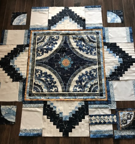 As you can see, there are still gaps between the plain border sections and the corner block…. I want to extend those sections and insert the seminole strip in the middle – the challenge is how to assemble all of that – I’m going to have to work with partial seams! What I don’t know yet are the dimensions I need for that spacer block (with the seminole strip) to have the corner come out correctly. It would be easy to piece it in the conventional way were it possible to put a seam across the seminole strip but I want that strip in a single piece from the wide on-point border to the corner!
