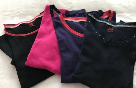 I wore them last year, but realized I wasn’t wearing them this year because the neckline was too high. So I moved them from the closet to my sewing space intending to remodel the neckline. Finally got to that today. Started by cutting off the crewneck ribbing and dropping the front about 2″. Then I cut 1 3/4″ x 24″ strips from some t-Shirt fabric I have on hand, serged the folded strip to each t-Shirt neckline. Remodelling complete. The contrasting neckband doesn’t look bad at all. And it lays flat – I tried them on. (I should have used dark serger thread to stitch on the new neckband, but hey, the stitching can’t be seen on the outside.)