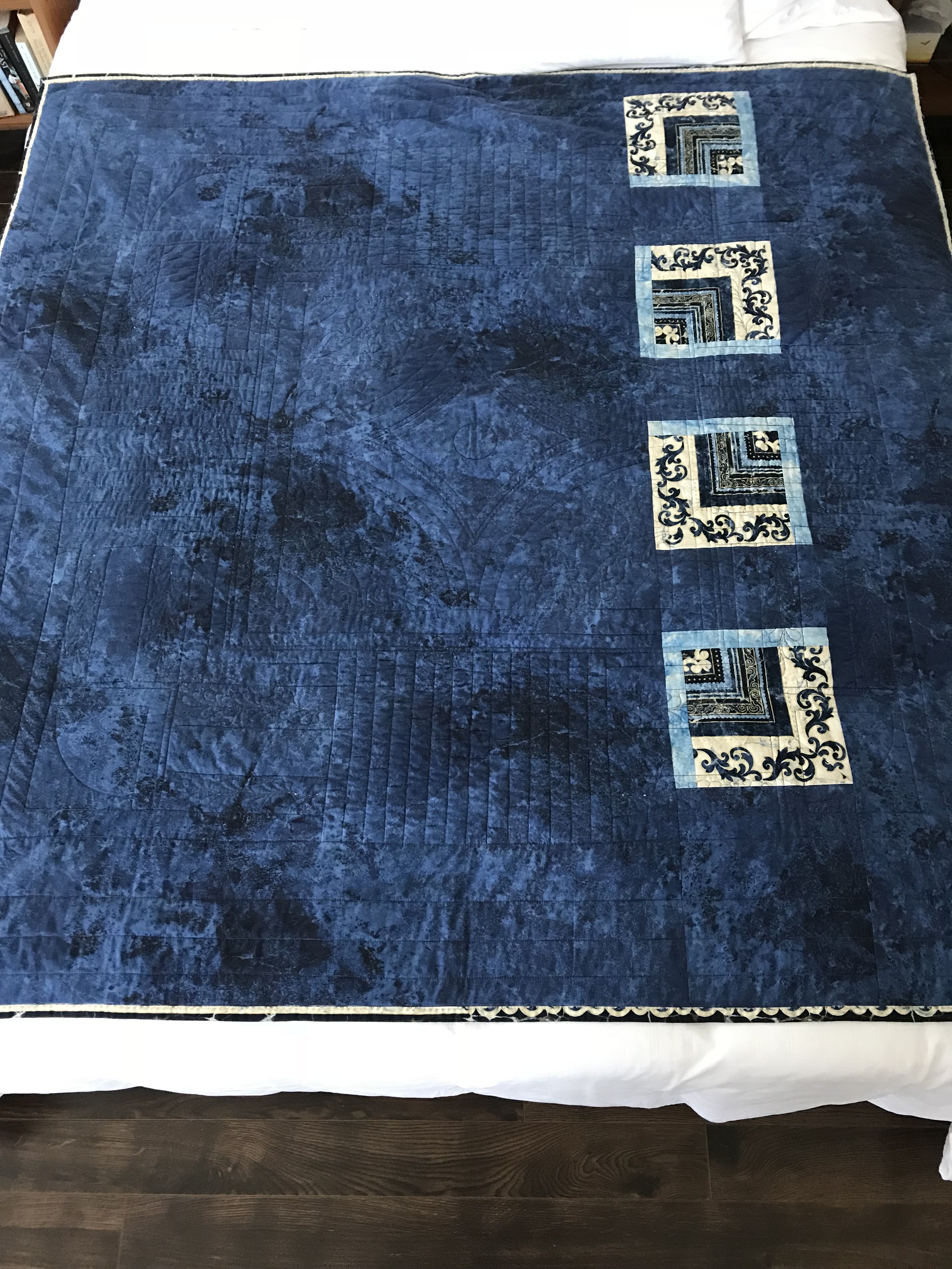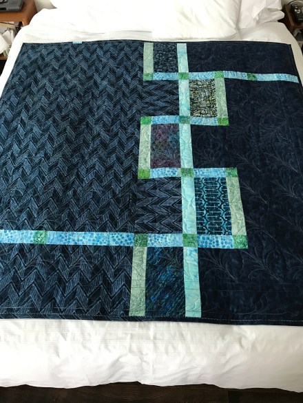 #4 – This back was for the Starburst Quilt: I had no fabric leftover from the quilt top so I decided to use other indigo fabrics highlighted with the turquoise and green elements.