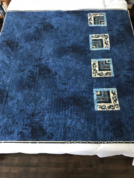 #6 – This is the back of the Medallion Quilt: I had just enough of the border fabric leftover to create these four mitred blocks. I decided to rotate them rather than keep them all facing the same direction. Spaced them out, offset top to bottom, with backing fabric because I had a lot of it.