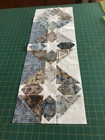 #2 – An opportunity to try some flying geese. The original blocks were all in shades of indigo but I decided to insert one gold triangle in each and it made a huge difference to the strip.