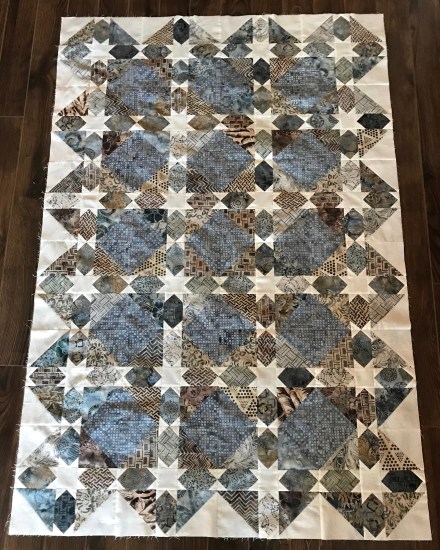 #9 – The back of the Asian Strips Quilt: I did the piecing of the on-point squares, added the filler and realized I still needed border/sashing to offset the insert strip from the backing fabric.