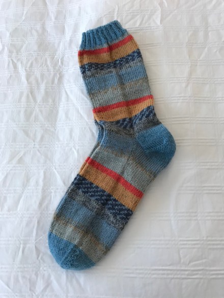 Finished last evening. This pair has a longer foot than I usually make – 60 rows from gusset to toe-off rather than 50. My friend wears a women’s size 10 shoe (as compared to my size 8) so I made the foot longer.