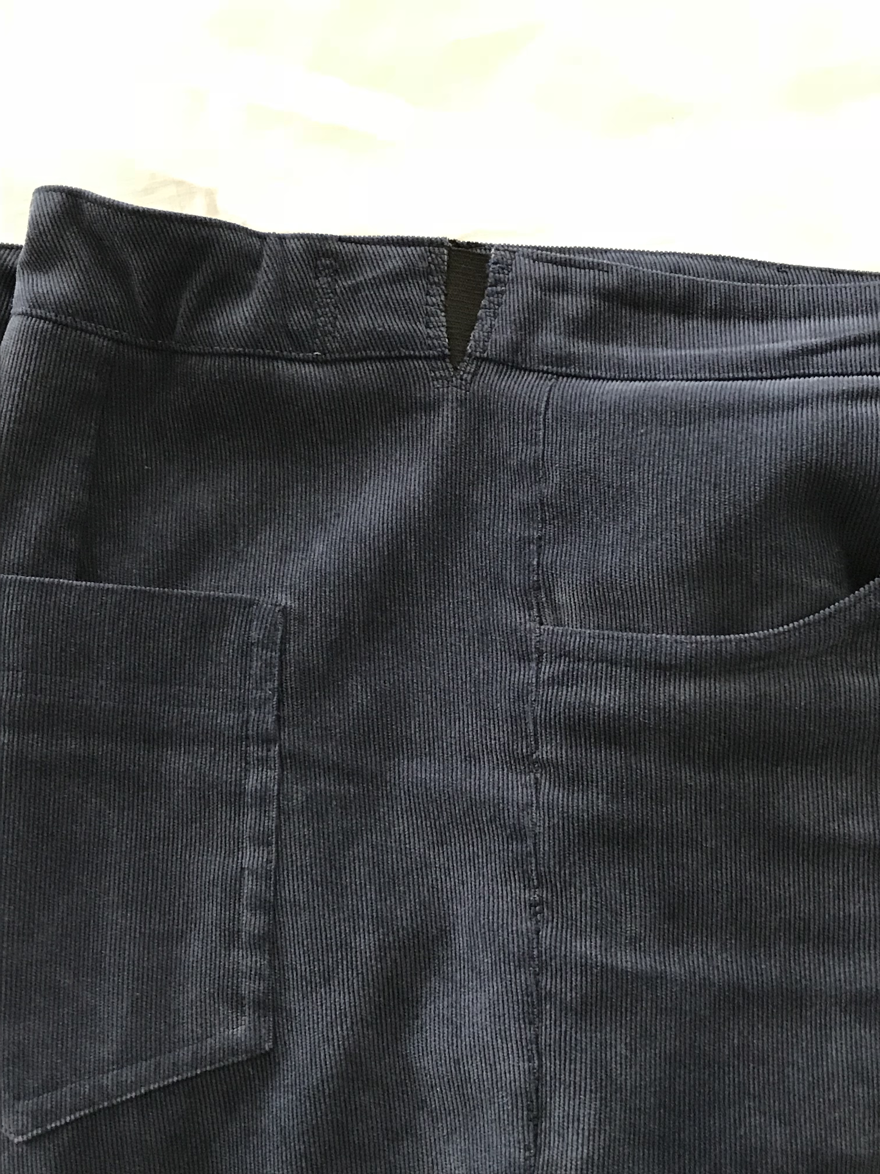 Yesterday, however, when I sat down to sew, wearing a pair of black corduroy pants I made many years ago (they are still in good condition and fit everywhere except in the waist!) I admitted I was uncomfortable. Over the last couple of years as I’ve grown shorter my waist has grown larger – and the waist in my pants has become tighter and tighter. I can still get the button done up, but the waist is just plain tight. Time to do something about it.