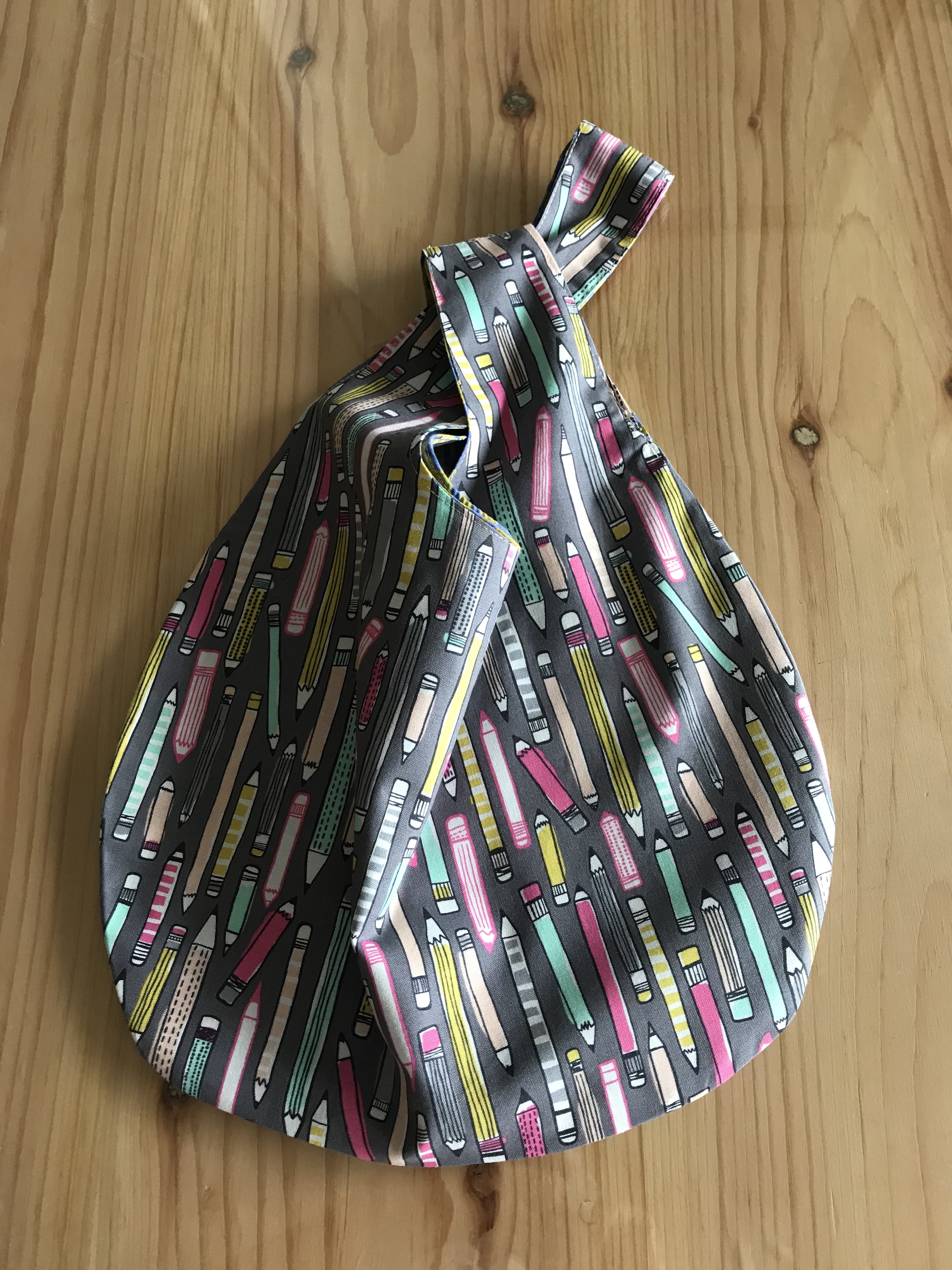 So here is my grab bag. It’s a good size for carrying a small knitting or hand sewing project. The problem with it as a mass produced gift is that it’s on the expensive side – in it’s simplest version (just two layers of fabric) it uses half a metre of each fabric (with useable scraps left over). Unless you happen on a good fabric sale I’d be making a sizeable investment were I to make, say, twenty of them given the cost of good cotton fabric these days. However, if you’re looking for something quick to make to give as a small gift you might find this grab bag worth your attention.