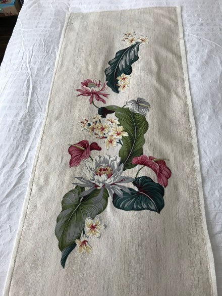 This morning I finally stopped procrastinating on the wall art – I found myself starting on two unexpected projects. Yesterday I was going through fabric in my stash looking for fabric for the Federer piece and came across some Hawaiian bark cloth with large floral patterns which I thought could be turned into an interesting raw-edge appliqué piece on a raw natural silk background fabric: