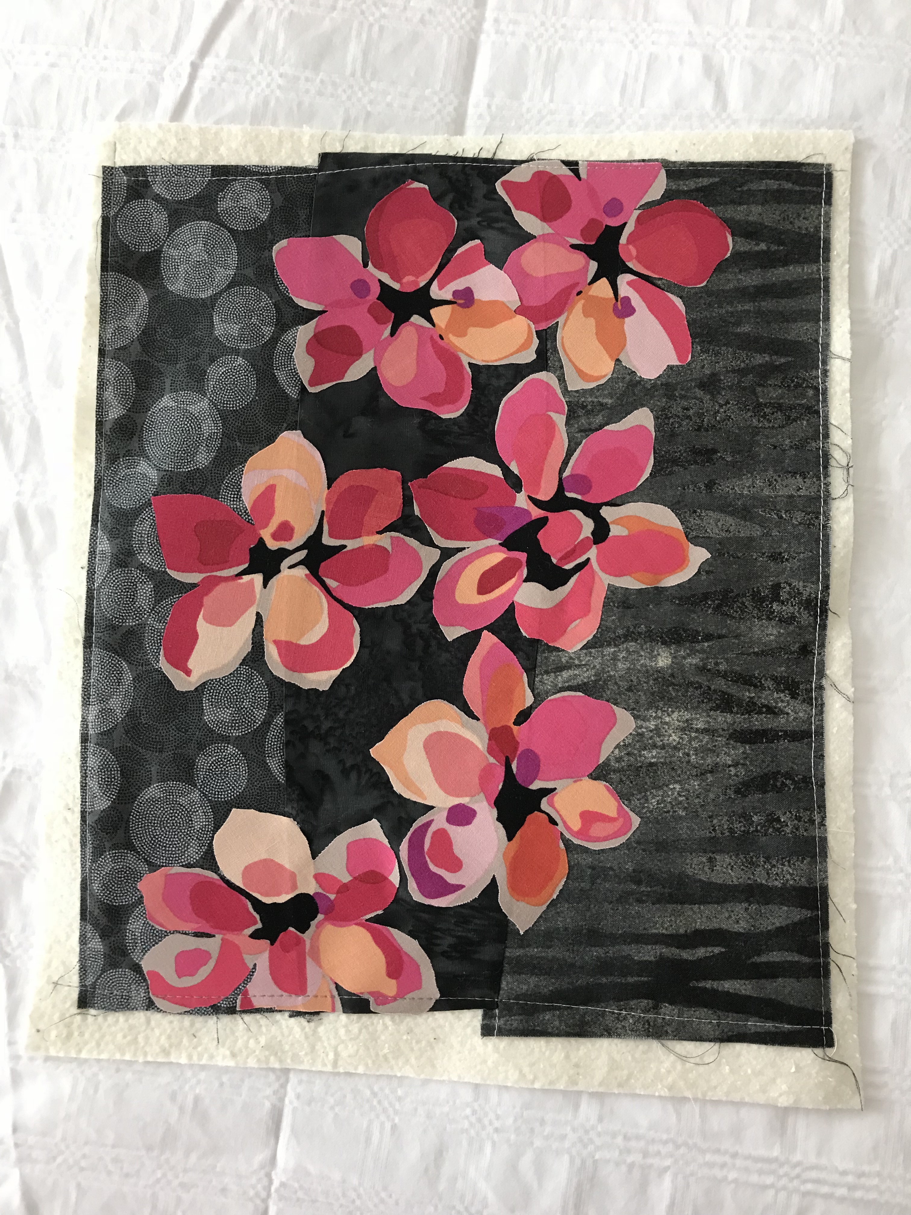 I cut the fabric in thirds, isolating one repeat of the pattern, fused Heat ‘N Bond Featherlite fusible web to the back of the fabric, fussy cut the flower/leaves elements, then fused them to a panel of natural raw silk (backed with Warm ‘n Natural quilt batting).