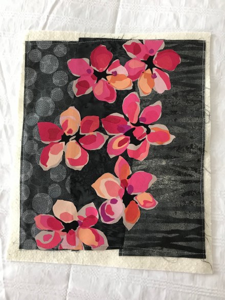I also got a second piece underway – I had a small leftover scrap of a modern floral which I’d used years ago to make a wide-brimmed summer hat. I thought the cut out flowers, placed randomly on a pieced background, would be an interesting vehicle for thread painting – I started that this afternoon. This piece will finish around 10″ x 12″ – it’s a test run to see where this idea can take me.