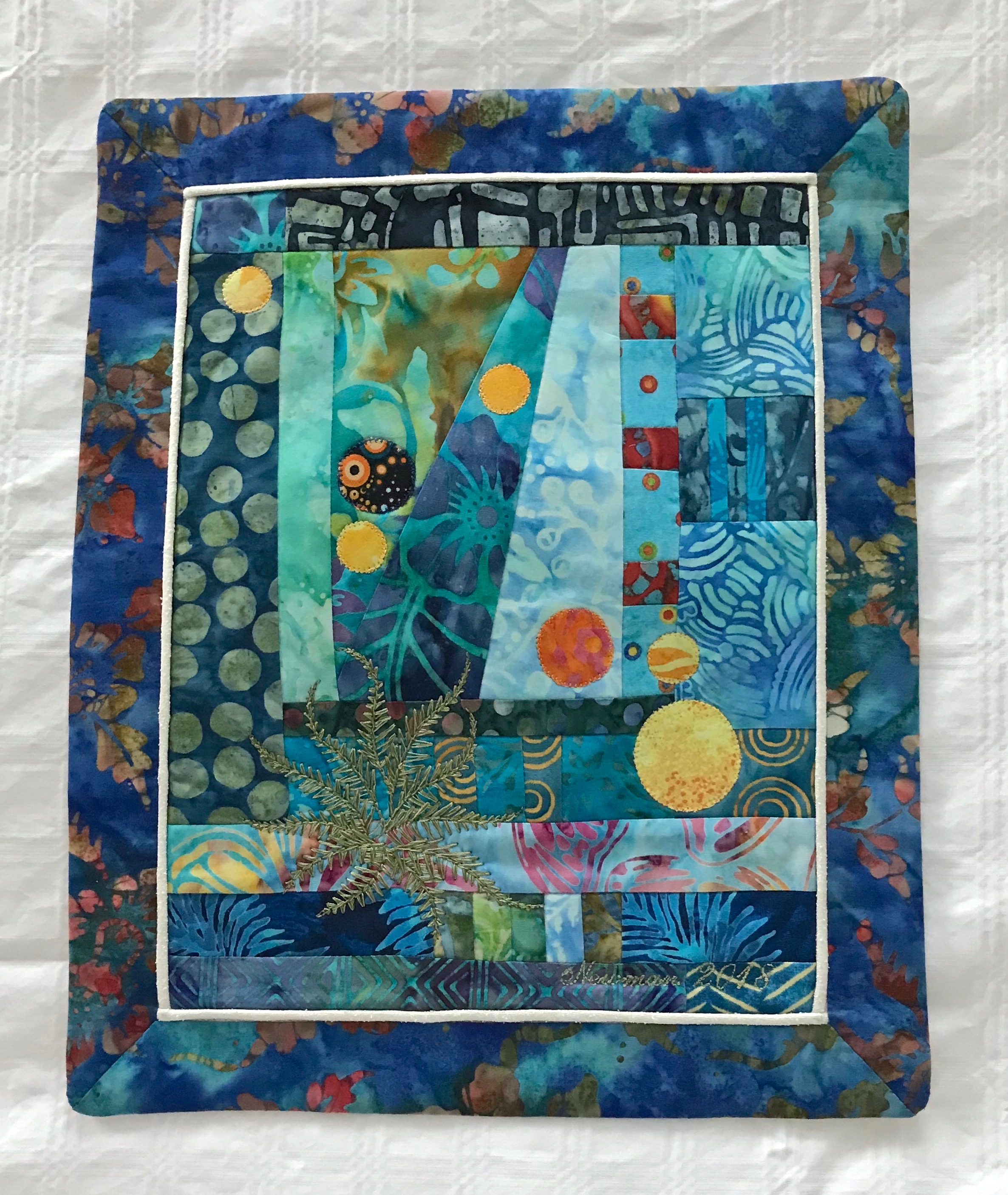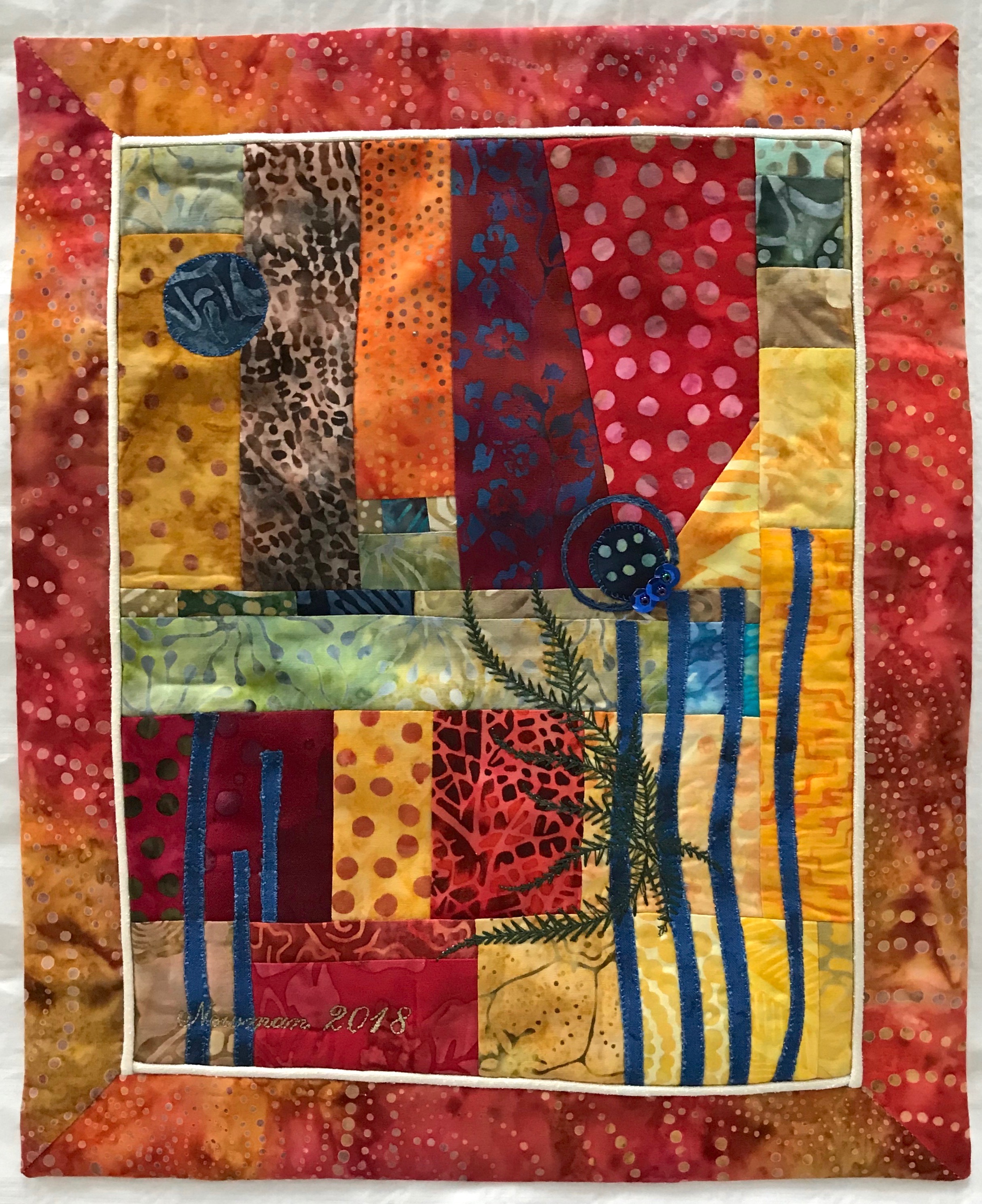 I also have no idea yet what to use to bind/border the panel. When I get the thread painting done, I’ll trim the panel, add the narrow silk inner border, then see what I have in my stash that might complement the panel itself and bring out the colour in it.